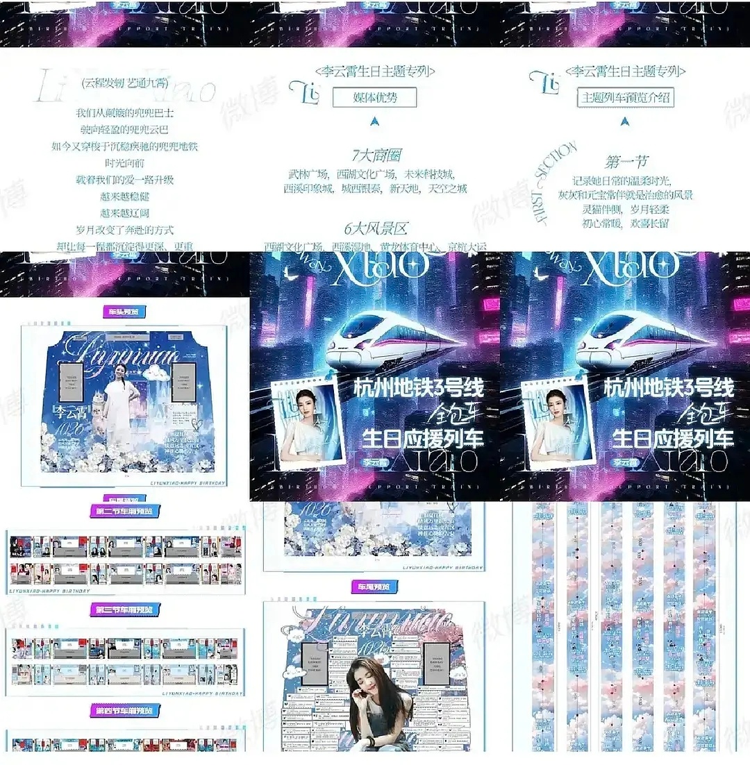 李云霄生日应援好牛,是杭州首位地铁全包车的女艺人,也是戏曲界首位地铁全包车的演员,10月整条杭州地铁3号线全覆盖李云霄主题,专列途经39座车站,贯穿余杭、西湖、拱墅、上城、临平5大城区,7大商圈、6大风景区和8大艺术文化区,实现360度全方位视觉呈现,共投放226张图片与291条文案,排面拉满![送花花]