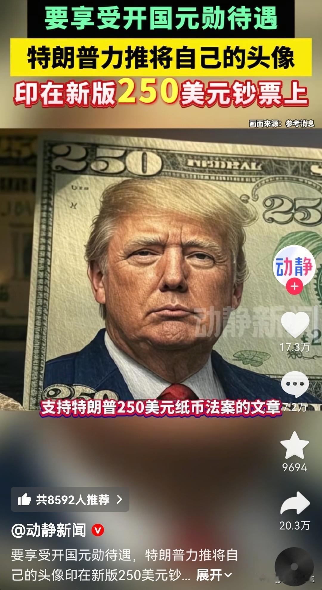 人到了年纪越大,越想让生命显得有意义,最后留下点什么,其实最后也就留下个笑话[我想静静][我想静静] 第一次对美元有兴趣,真想换一张,看看特朗普250具象化的模样!