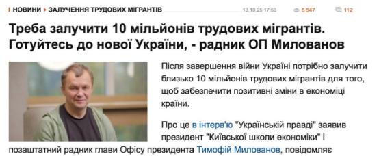 为新乌克兰做好准备:这个国家需要1000万移民。 据乌克兰媒体报道称,乌克兰总统办公厅顾问米洛瓦诺夫表示:“战争结束后,我们将需要引进大约1000万劳工移民。” 米洛瓦诺夫说战争结束后乌克兰得引进1000万劳工移民,这话其实就是乌克兰现在没办法了,毕竟战争把国家的人口和经济都折腾得不行,不这么做根本撑不住重建,每一个数字背后都是这个国家实实在在的难处。 战前乌克兰最多有将近4500万人,可到2025年就只剩3400万了,没几年就少了近千万人,这里面能干活的劳动力少得最厉害。 战场上的伤亡直接让人口像被绞肉机绞过一样,俄罗斯国防部说乌军那些恢复不了的损失加起来有170万人,就算西方智库算得保守,说总共伤亡40万,那也意味着好多正能干活的男性没了。 更让人担心的是,好多难民跑出去,还把技术人才也带走了,联合国难民署统计到2025年9月,登记的难民就有950万,大多去了波兰和德国,这些难民里65%都是能工作的年纪,而且IT行业的人和医生占了40%,等于直接把乌克兰的技术核心给抽走了。 生育率也崩了,这就让人口自然恢复彻底没指望了。战前乌克兰每个女性平均就生1.2个孩子,本来就低于2.1的人口更替水平,打仗之后更是跌到0.7以下,成了全球生育率最低的国家之一。 2025年上半年刚出生的孩子才86795个,可同一时间去世的人就有249002个,每生1个就有3个人去世,这种“生的没亡的多”的情况还在越来越糟。 年龄结构的断层也很难补回来,现在乌克兰人的平均年龄已经到41.8岁了,18到35岁的男性只占15%,能生孩子的人也少了,就算现在马上停火,要修复人口结构也得几十年,可重建哪能等几十年啊,只能靠移民来填这个缺口。 再说说重建需要的劳动力,5240亿美元的重建费用背后,是一大堆没人干的岗位。 能源领域最先受影响,差不多80%的火力发电和三分之二的水力发电设备都被破坏了,要修这些核心能源设施得花680亿美元,国际能源署算过,单说氢能产业,每生产250万吨氢气就能创造10万个工作岗位,这里面虽然70%是临时的,但还是需要大量的产业工人。 交通设施重建也得花近780亿美元,修公路、桥梁、铁路都离不开建筑工人,可乌克兰的建筑市场比战前差了49%,2025年初新开工的项目还不到去年同期的一半,最核心的问题就是没人手。 农业以前是乌克兰的支柱产业,现在产量少了一半,小麦出口从全球的28%跌到10%,农村有一半的地方都空着,粮食自给率也降到40%,地里干活、粮食加工都需要人来补空缺。 工业和商业重建得花640亿美元,制造业、服务业要恢复也离不开熟练的工人和技术人员,可现在乌克兰能干活的人就剩950万,还得养着近1900万不能工作的人,单靠自己国家的劳动力根本撑不起重建。 其实乌克兰早就开始为吸引移民做准备了,泽连斯基之前就签了法令,允许合法待在乌克兰的外国人自愿加入国民警卫队,还承认双重国籍,那时候就放出了“用身份换人力”的信号。 只是那时候主要是想补充兵源,现在米洛瓦诺夫提议把目标转向劳工移民,是因为战争结束后,对兵源的需求会让位于经济复苏的需求。 国际社会承诺给乌克兰4300亿美元的双边支持,这里面一半是用在非军事方面的,这些钱要变成重建的实际成果,必须得有劳动力来做载体,不然再多的钱也只能放着没用。 从实际情况来看,1000万移民这个数字看起来多,其实是根据人口缺口算出来的——从2014年开始,乌克兰已经少了1000万人,要是想恢复到战前的劳动力规模,还能撑得起重建,补充这么多移民是唯一的办法。 这些移民不是随便找的闲人,而是专门针对那些缺人的职业,比如能源领域的技术工人、建筑行业的施工人员、农业领域的种地方能手、医疗系统的医护人员,还有IT行业的技术人才,毕竟这些领域都是被战争毁得最厉害、本土人才跑得多的地方。 对乌克兰来说,引进1000万劳工移民不是选不选的问题,是能不能活下去的问题。没有足够的劳动力,5240亿美元的重建计划就是空谈,农业恢复、能源修复、工业重新启动都没法提;没有劳动力创造价值,近1900万不能工作的人的生活保障会把财政拖垮,好不容易争取到的国际援助也会白费。 米洛瓦诺夫这个提议,说到底就是给“战后乌克兰咋活下去”找个办法,毕竟一个没了劳动力的国家,再大的重建计划也只能是纸上谈兵。