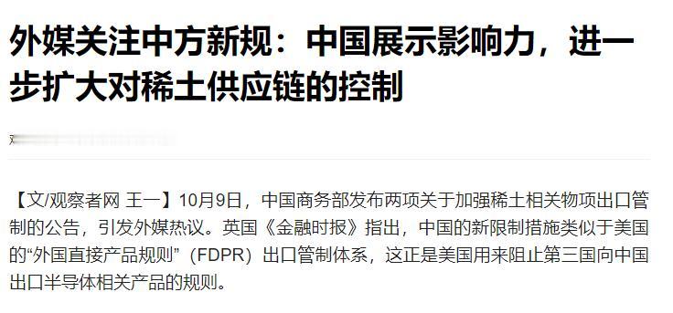 10月12日,日媒揭露中国被彻底激怒的真正原因,日经新闻网周六称,中国近期出台史上最严稀土新规,其根源在于美国9月底强化的实体清单50%规则,连坐制实体清单被彻底激怒。美国将黑名单企业及其持股超过50%的子公司和关联企业全部封锁,波及中国数千家企业,半导体和AI行业出口订单骤降,中国采取史上最严稀土新规作为反制。 更让人窝火的是,美国还特意设了60天缓冲期,但这缓冲期只给自家本土企业和盟友用,压根没给中方任何协商的机会。这种单方面划圈子的操作,明摆着就是霸权主义,既短视又危险。 要知道,这些中企里,不少都是给全球产业链做配套的,比如某半导体封装企业,本身没被直接制裁,但因为母公司持股60%在清单上,突然就没法拿美国的光刻胶了,生产线直接停摆;有AI设备厂商更憋屈,原本谈好的东南亚订单,就因为合作方有美国资本背景,怕被连带制裁,硬生生把订单转给了韩国企业,光这一笔就亏了8亿。 美国这招显然是铁了心要卡中国科技的脖子。之前3月刚制裁过54家中企,9月中美经贸会谈前又加了23家,这次干脆用“连坐制”断产业链。 半导体行业首当其冲,有数据显示仅核心配套企业就有上百家被波及,不少企业的美国订单直接腰斩,某芯片设计公司原本到手的10亿美元订单,因为下游组装厂被“连坐”,对方当天就撕毁合同。 AI领域更惨,很多企业依赖的美国算法授权被突然叫停,研发进度直接滞后半年,出口订单跌幅一度超过40%。 中方其实一直抱着沟通的想法,之前5月还和美国就稀土问题达成过临时协议,用许可证制度给合规企业留了口子,但美国这波操作等于直接掀了谈判桌。这种单方面划圈子的霸权行为,彻底浇灭了中方的信任,反制自然顺理成章。 而稀土恰恰是中国最有底气的反制筹码——全球80%的稀土产量都出自中国,尤其是中重稀土,几乎被咱们包圆了,美国自己虽然有稀土矿,却连完整的冶炼产业链都没有,多年来全靠从中国进口。 这次出台的稀土新规堪称“史上最严”,一天之内连发六项公告,把稀土产品、技术、设备甚至二次回收都管了起来。 最关键的是首次把境外实体纳入管制,不管谁想出口含0.1%以上中国重稀土的产品,都得拿许可证,涉及军事用途或14纳米以下芯片制造的申请,要么直接拒,要么从严审查。 这等于在稀土流动的关键节点设了“安检门”,精准卡住美国高科技产业的命门——现代半导体制造、军工设备全都离不开稀土,美国想卡中国芯片的脖子,中国就用稀土捏住它的供应链。 中国早就掌握了高效的稀土分离提纯技术,而这门技术环保成本高、工艺复杂,西方国家早年都因为不划算放弃了。新规直接禁止未经许可向境外提供冶炼技术,这下彻底断了美国建替代供应链的念想。 美国5月刚给本土企业发了21亿美元补贴,想2027年把本土冶炼产能提至全球15%,还和巴基斯坦签了稀土合作协议,结果巴基斯坦压根没加工技术,中国一卡技术,这俩计划全成了泡影。 有专家算过,没有中国技术,美国想实现稀土自主至少得等五到十年,这期间它的F-35战斗机、新能源电池产业都得面临断供风险。 中国这波反制其实早有布局,今年5月的许可证制度就是伏笔,平时放水让合规企业过,需要施压就拧紧阀门。比如之前美国禁售航空发动机,中方没直接断稀土,就靠延迟许可证审批,逼着美方在谈判中让步。 这次的新规更把管控延伸到了稀土全生命周期,连二次回收技术都管,就算美国想从废旧设备里拆稀土,没中国技术也玩不转。 反观美国,手里的牌早打光了,对中国商品的关税已经加到33%-50%,再加税只会坑自己的消费者,建本土产能又绕不开环境、技术、时间三座大山,根本没法跟中国耗。 欧盟、日本这些高科技密集地区同样依赖中国稀土,现在被迫在中美之间选边站,美国本想靠“连坐制”逼这些国家疏远中企,结果反而让它们怨声载道——德国某汽车厂商就公开抱怨,因为稀土供应不稳,旗下电动车生产线已经减产20%。 说到底,美国这是用霸权挑战市场规律,而中国的稀土新规不过是“以彼之道还施彼身”,既然美国不讲规矩,那中国自然要拿出能定规矩的底气。
