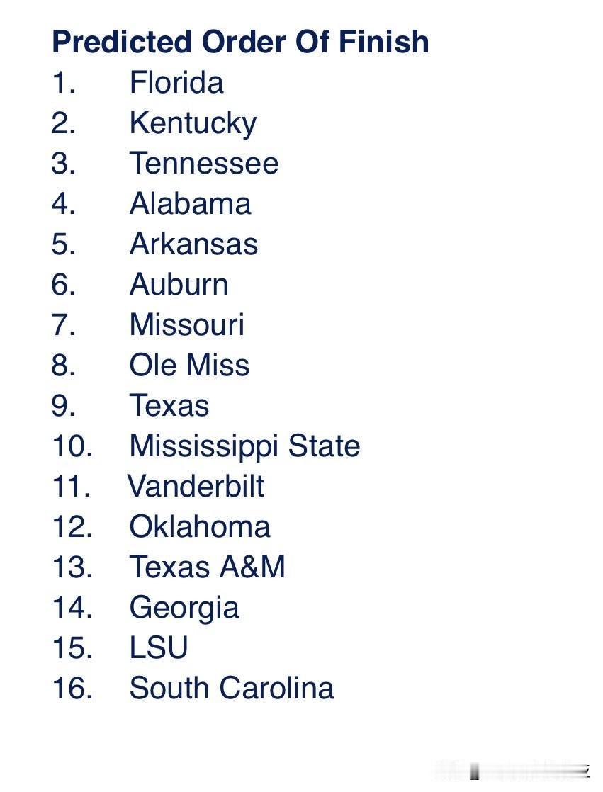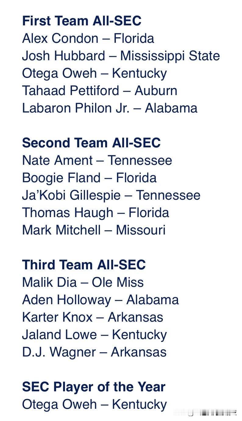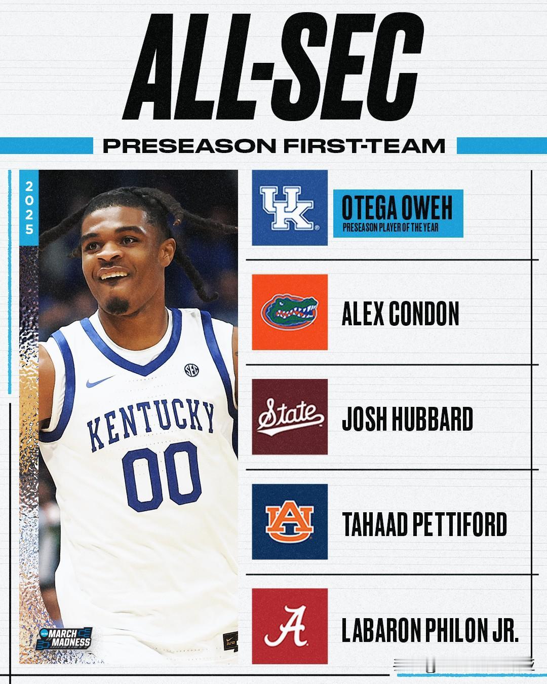 佛罗里达大学被预测是SEC联盟冠军,肯塔基与田纳西紧随其后,后卫Otega Oweh被预测是SEC联盟最佳球员,第一阵容还有奥本Tahaad Pettiford,密西西比州立Josh Hubbard,阿拉巴马Labaron Philon与佛罗里达Alex Condon,2026年nba选秀 田纳西Nate Ament是唯一入选的新生。