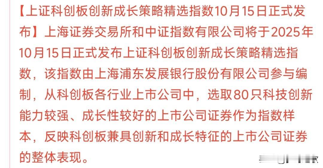 科创板重大利好来了,新指数即将于明天发布 这次科创板发布的指数以创新成长为主,也就是说首批选中的80家个股将是创新成长的代表,而且是经过国家认证的,这对于这80家个股来说是巨大的利好消息。 最重要的是:通过聚焦研发投入高、营收增长快的科创企业,间接引导社会资金向硬核科技领域的高成长公司聚集,资金进入公司后会助推公司快速成长,而投资者将会得到回报,这就是一个正向的积极的循环。