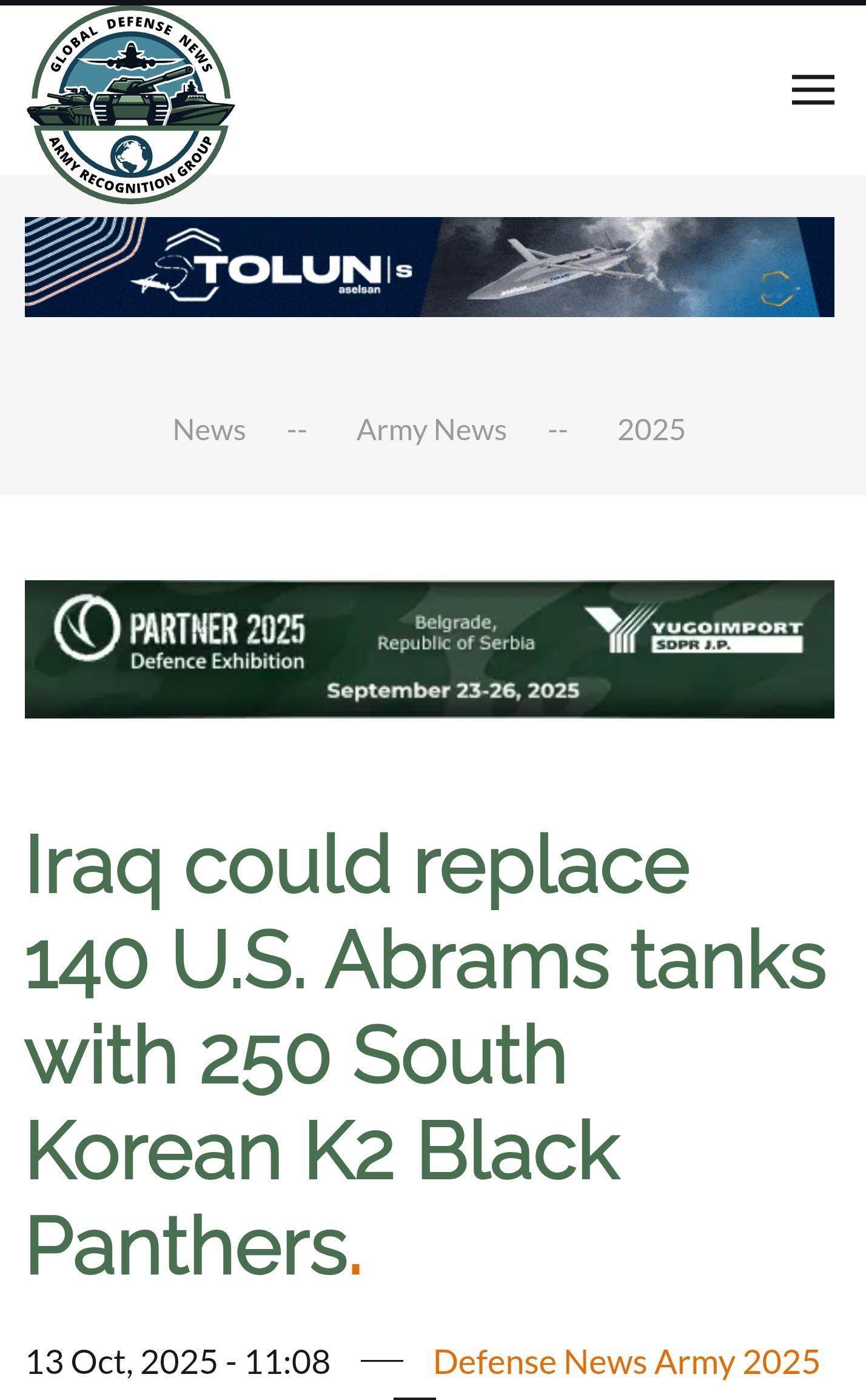 韩国媒体称伊拉克想要采购250辆K2坦克来替换部分的M1、T-90、T72等坦克,价值65亿美金。K9自行榴弹炮和天橆火箭炮也很有可能成套引进。