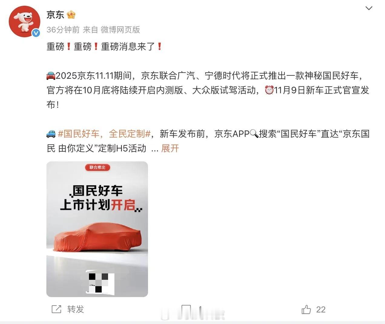 京东造车京东跨界造车了,联合宁德时代、广汽推出“国民好车”,不知道会是什么价位的[doge]