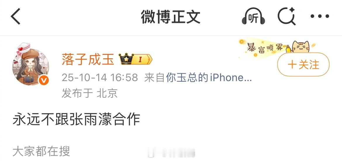 落子成玉还置顶了“永远不跟张雨濛合作”