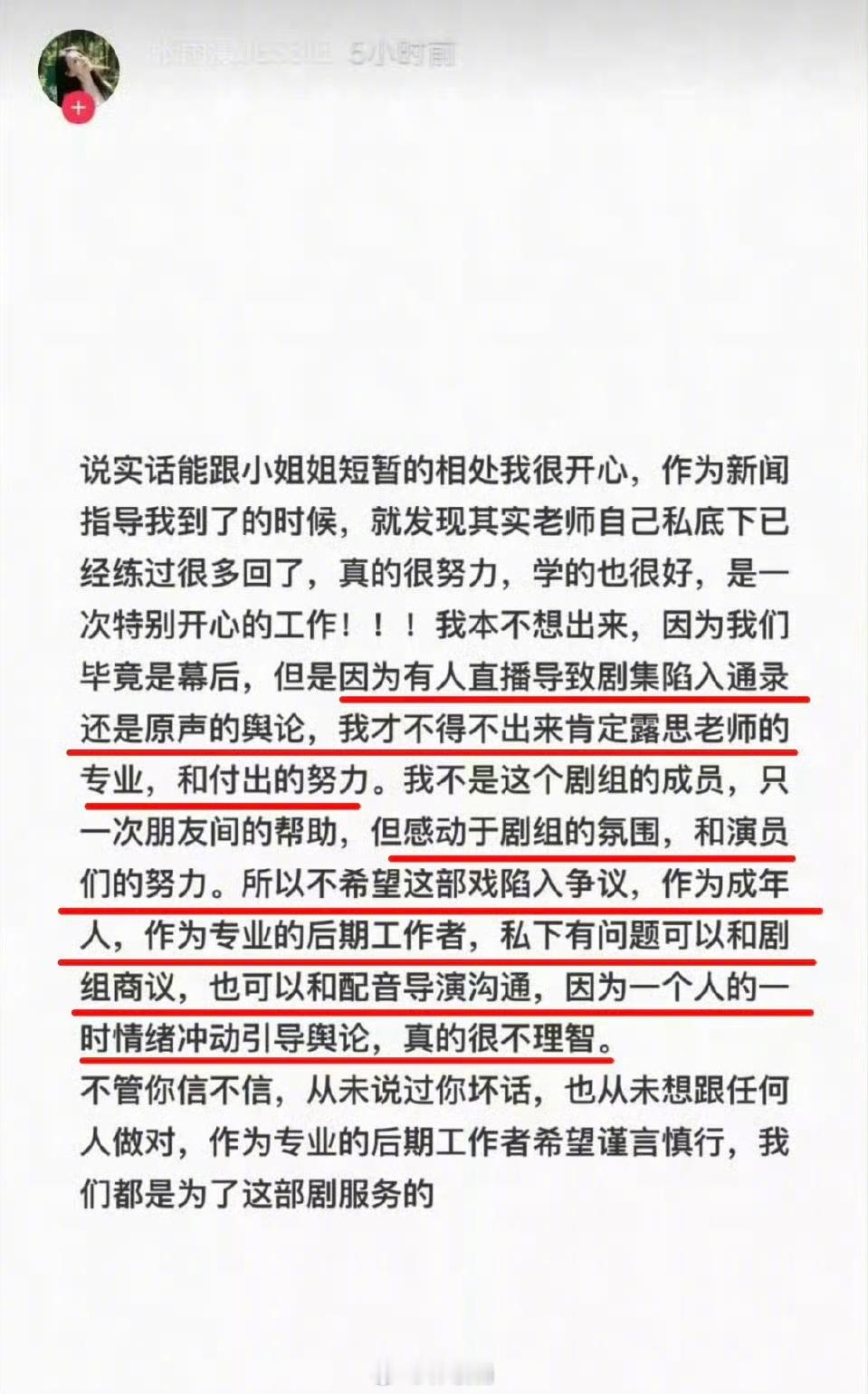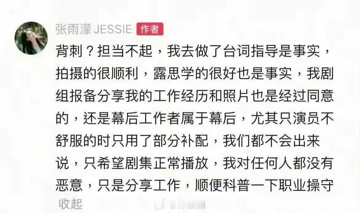 之前落子成玉提到的台词指导张雨濛也出来回应背刺称“幕后工作者属于幕后,尤其只演员不舒服的时只用了部分补配,我们都不会出来说”