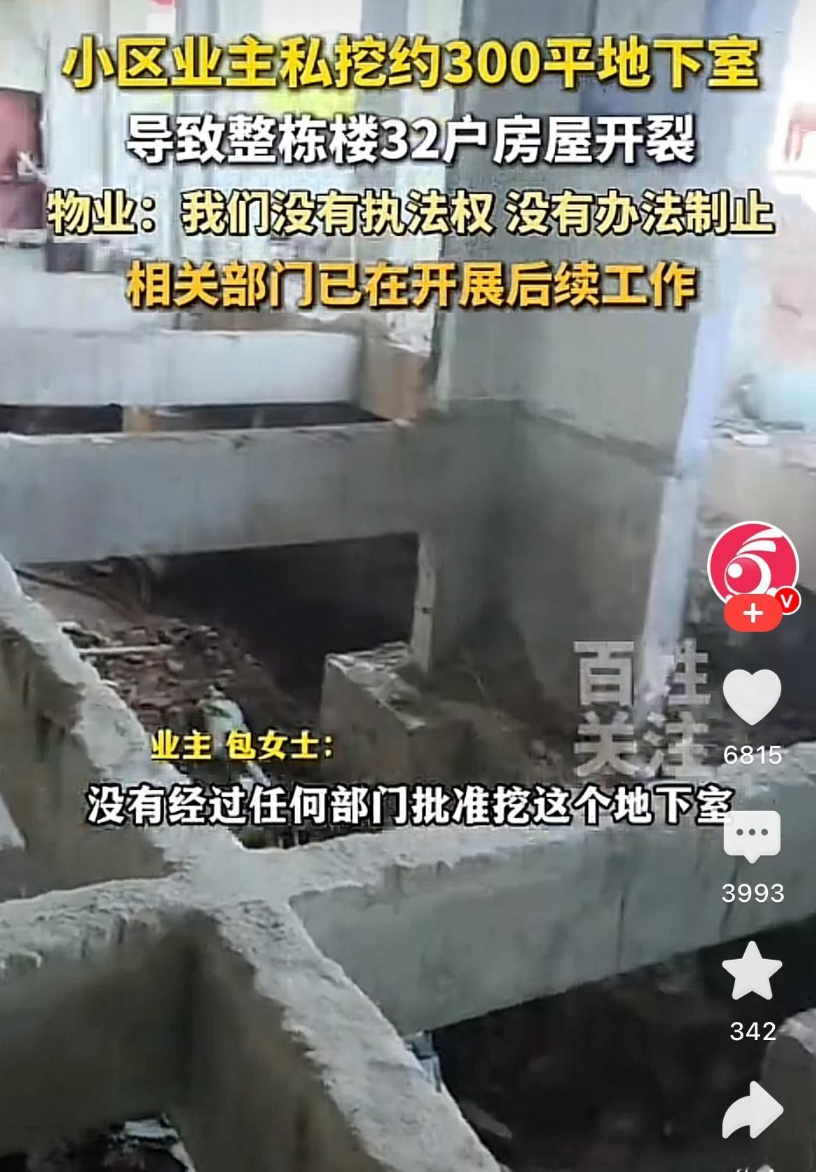 霍山小区房屋开裂,我忍了, 小区物业不作为,我也忍了, 但是业主竟然挖了300平米地下室,我震惊住了! 300平地下室,四分之三的篮球场那么大,而且是挖了3米深,从8月开始白天挖机响晚上运土,3米高围栏挡得严严实实,9楼墙面裂成网,窗台大理石断了渗水,墙皮都泡烂了。 现在32户住着带裂缝的房子,白天怕墙皮掉,晚上怕楼塌,物业说没执法权管不住,政府发了10天安置费又停了,问题却没人解决,就这么干耗着。 挖地下室的人图自己方便,把整栋楼的安全都搭进去,这是真的搁谁都忍不了!