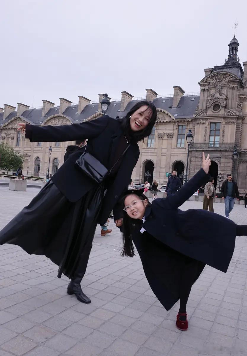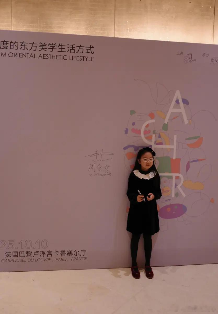 朱丹8岁女儿作品在卢浮宫展出 母女俩在展板前合影超有爱