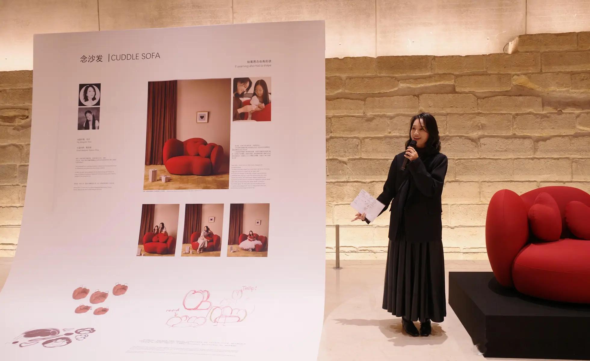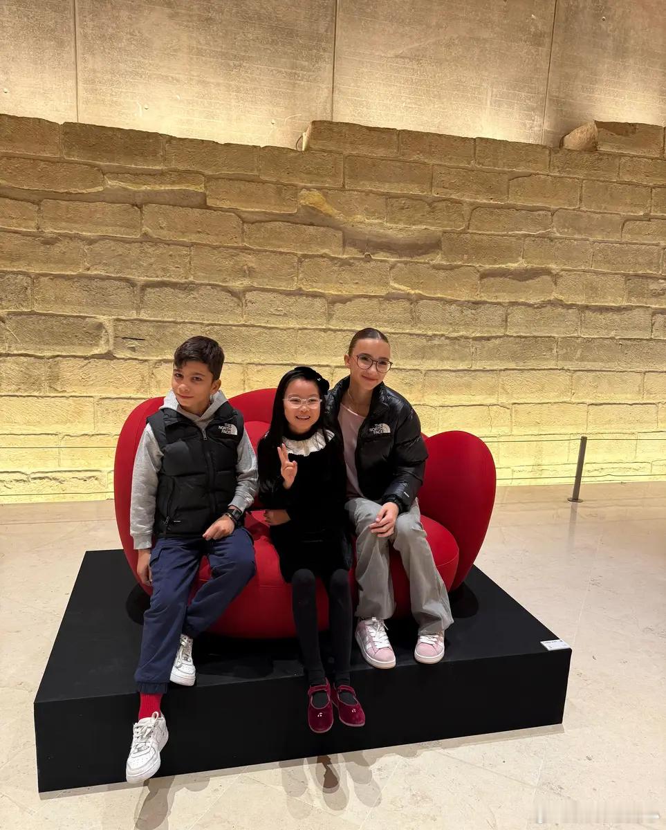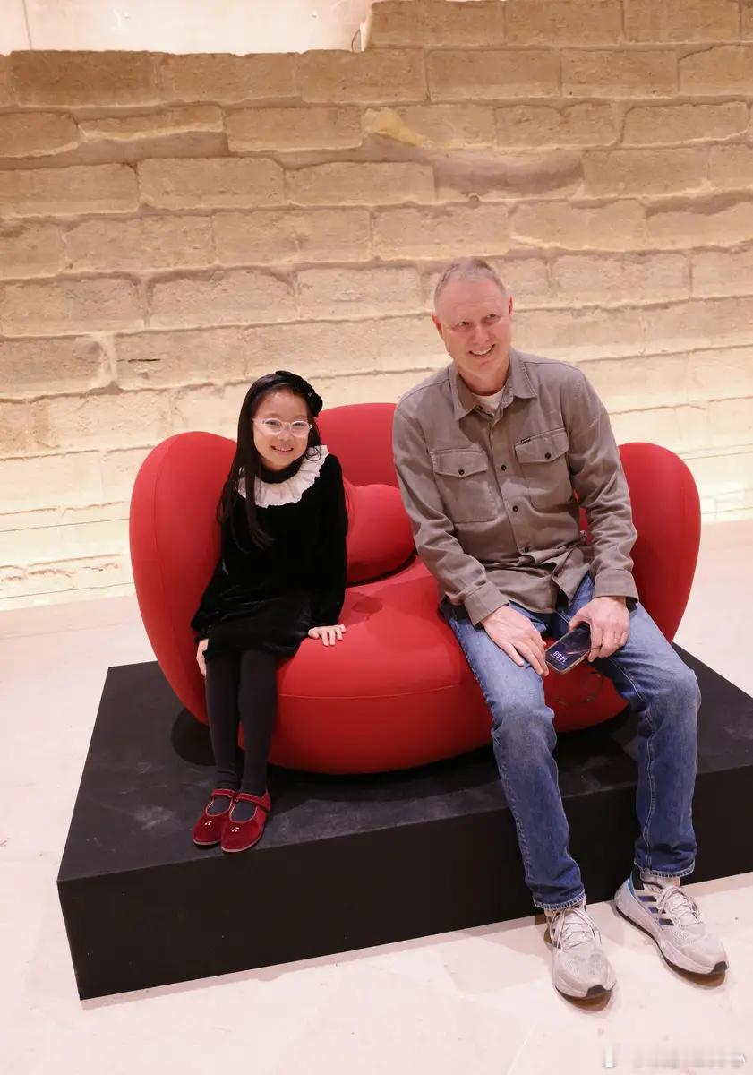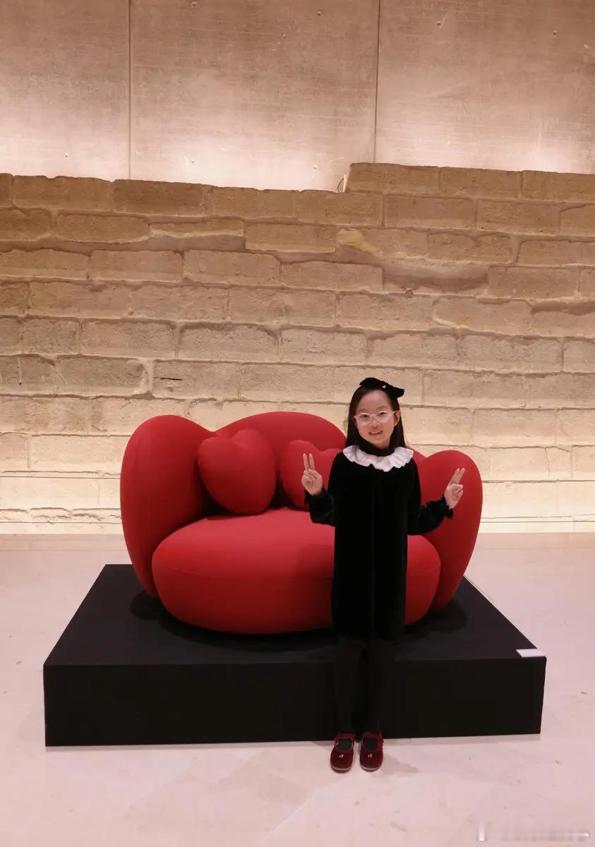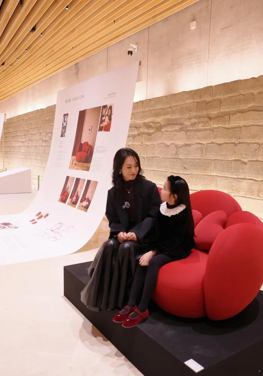 10月14日,一组朱丹和女儿的照片流出。图中,朱丹女儿设计的沙发在卢浮宫展示,母女俩在展板前合影。