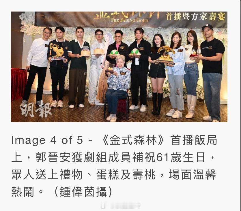 郭晉安、羅蘭、莊子璇、何依婷、羅子溢、羅天宇及陳庭欣等,昨晚(13日)出席劇集《金式森林》首播飯局。眾人為郭晉安補祝61歲生日,送上禮物、蛋糕及壽桃。談到今年與李珊珊一同慶祝生日,郭晉安表示兩人同天出生,又說慶祝活動以月計。他表示:「這部劇去年煞科時正值我生日,希望來年生日能與原班人馬再度合作拍攝新劇。」被問及可想第四度登視帝寶座,郭晉安說:「我沒想過,視帝是一種感覺,比起自己得獎,我更想這部劇成功。」