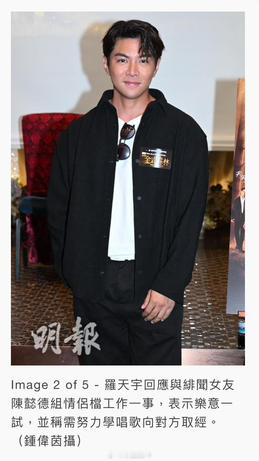 羅天宇談到緋聞女友陳懿德想與他組情侶檔工作時笑言:「她這樣說,我當然無所謂,可以一試。我要用心學唱歌,因為她歌藝好,要跟她學習。」至於可會公開戀情以提升CP值,他則刻意迴避,裝傻反問「吓,咩話」。