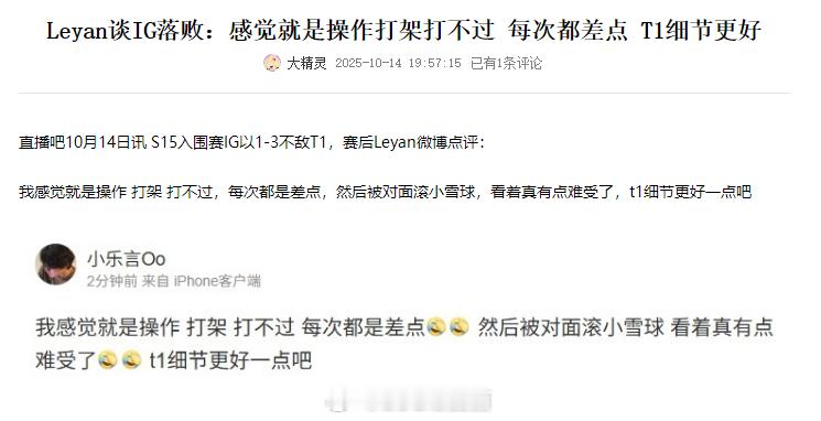Leyan谈IG落败:感觉就是操作打架打不过 每次都差点 T1细节更好