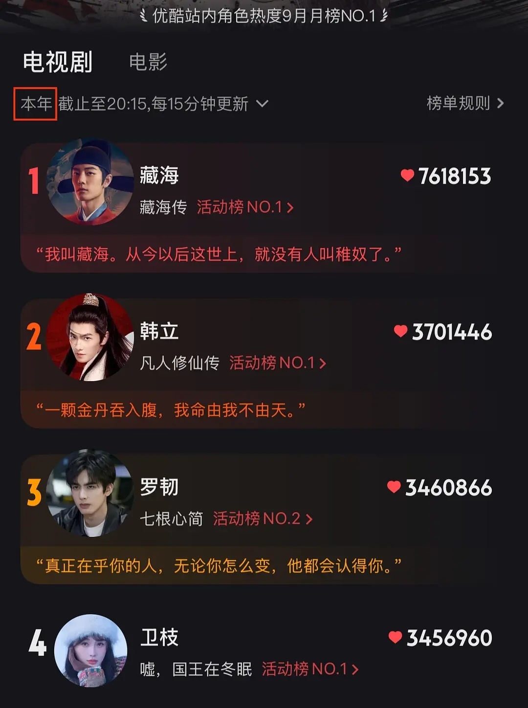 宋威龙《七根心简》👖拉新年榜前9,罗韧角色年榜前3,《韶华若锦》🥭台cvb年4