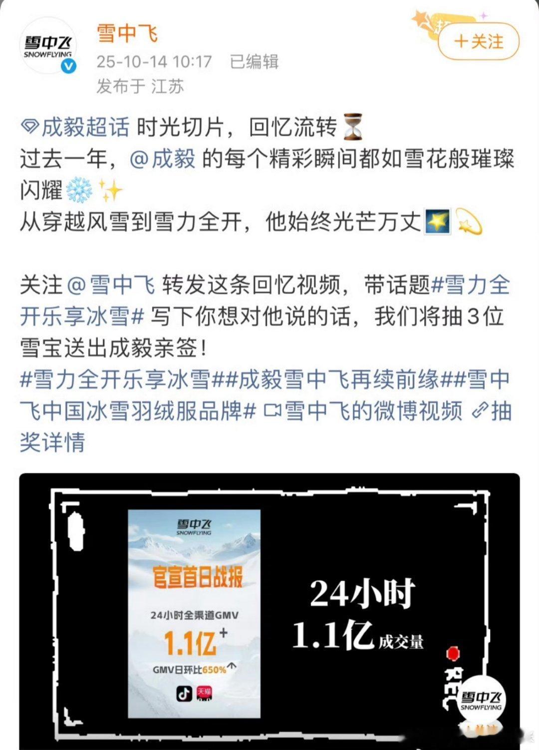 雪中飞和成毅续约了,回想24年官宣当天24小时全渠道GMV突破1.1亿+,日环比