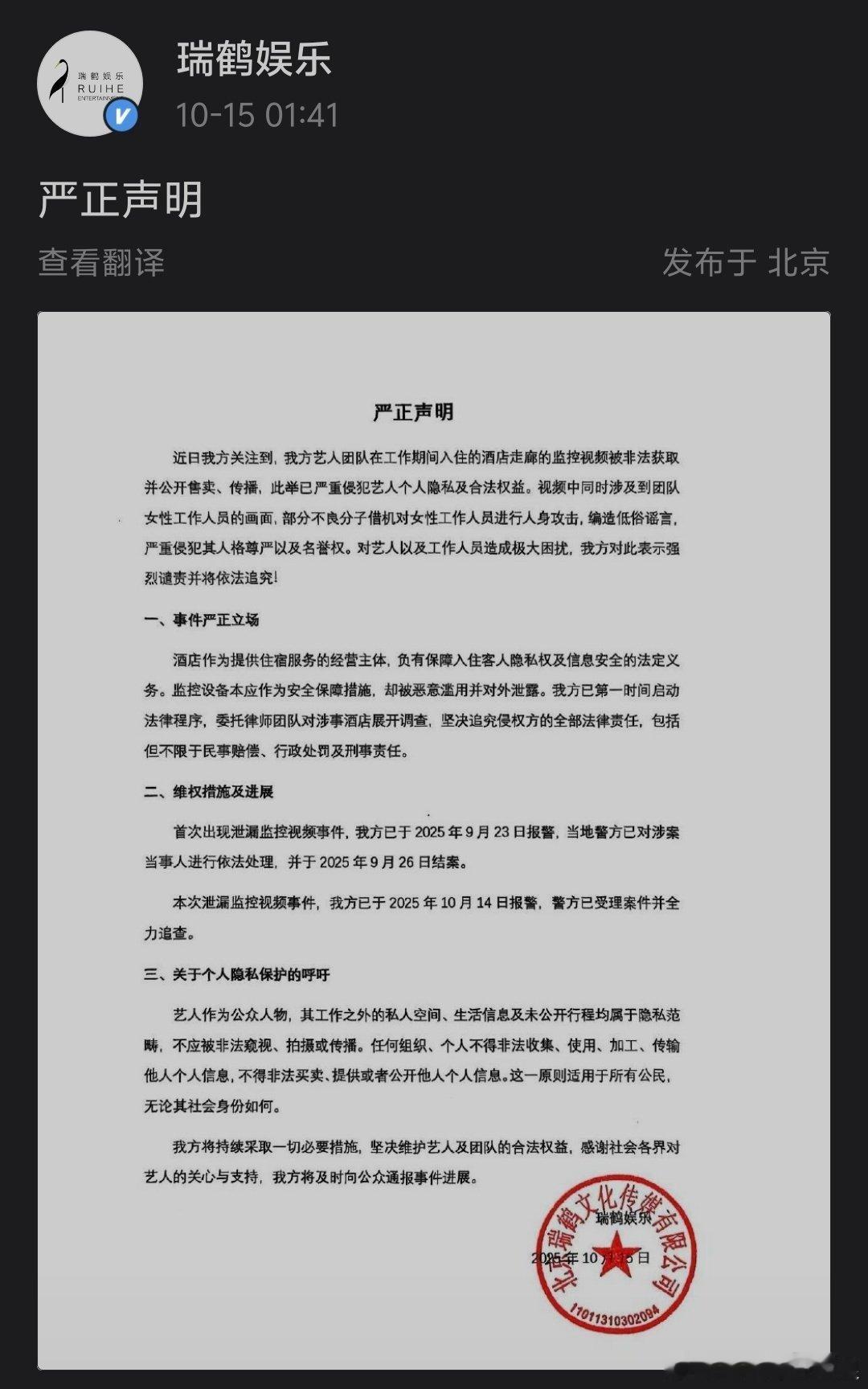 瑞鹤娱乐针对梓渝酒店发严正声明:酒店走廊的监控视频被非法获取并公开售实、传播,这对艺人以及工作人员造成极大困扰。此举已严重侵犯艺人个人隐私及合法权益。已第一时间启动法律程序,委托律师团队对涉事酒店展开调查!支持维权。