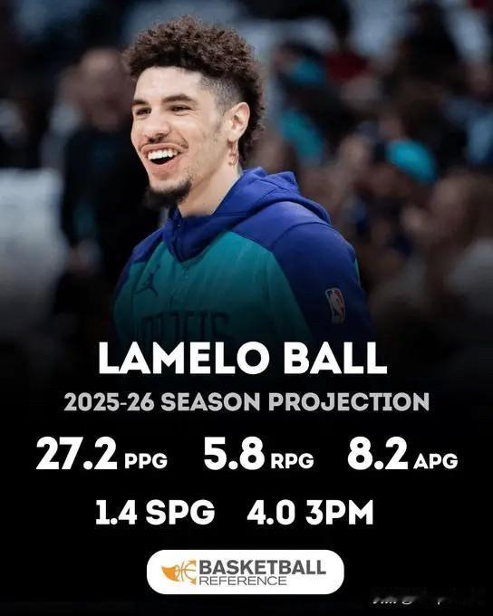 知名数据媒体Basketball Reference更新动态,预测了拉梅洛-鲍尔下赛季的场均数据: 场均27.2分5.8板8.2助1.4抢断4.0记三分。 三球上赛季场均25.2分4.9篮板7.4助攻,但仅打了47场比赛,已是近三年来的最多。