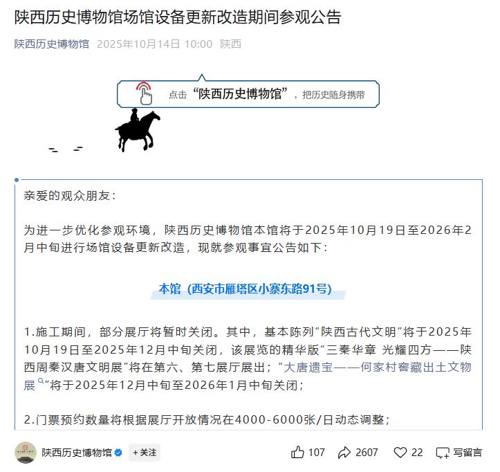 【参观有变!】10月14日,陕西历史博物馆发布重要公告:为进一步优化参观环境,该博物馆本馆将于2025年10月19日至2026年2月中旬开展场馆设备更新改造工程。 据悉,施工期间,部分展厅将暂时关闭。门票预约数量会依据展厅实际开放情况动态调整(4000-6000张/日),游客可密切关注官方预约渠道,合理规划行程。同时,西停车场北侧区域将临时封闭,届时停车位数量将大幅减少,自驾前来的游客需提前了解停车信息,选择合适的停车地点。 陕西历史博物馆作为展示华夏文明的重要窗口,此次设备更新改造意义重大。虽会给部分游客带来不便,但短暂的不便是为了日后更优质的参观服务。期待改造后的博物馆全新姿态,为公众带来更精彩的文化盛宴。 另外,位于西咸新区秦汉新城兰池三路东段的秦汉馆自10月19日起,观众可刷身份证免预约直接入馆。