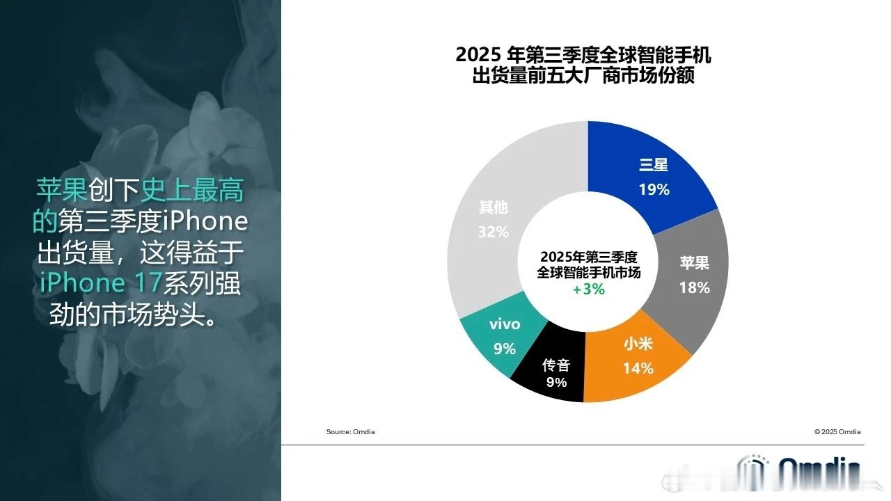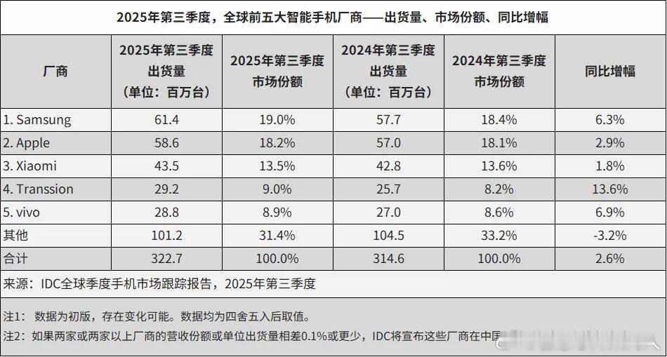 Omidia和IDC的数据基本一致,25Q3全球智能机销量前5是三星,苹果,小米,传音和vivo。