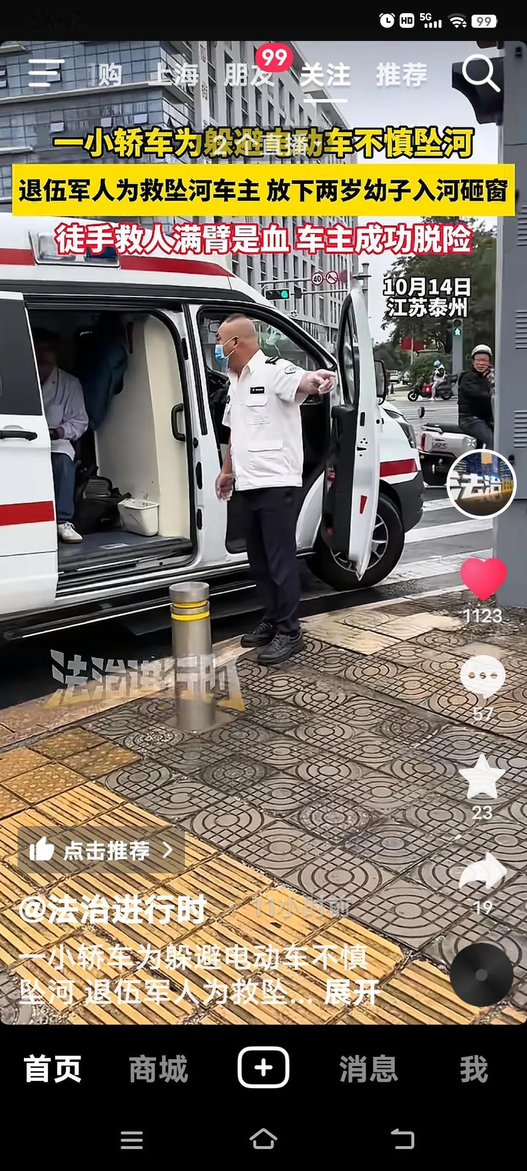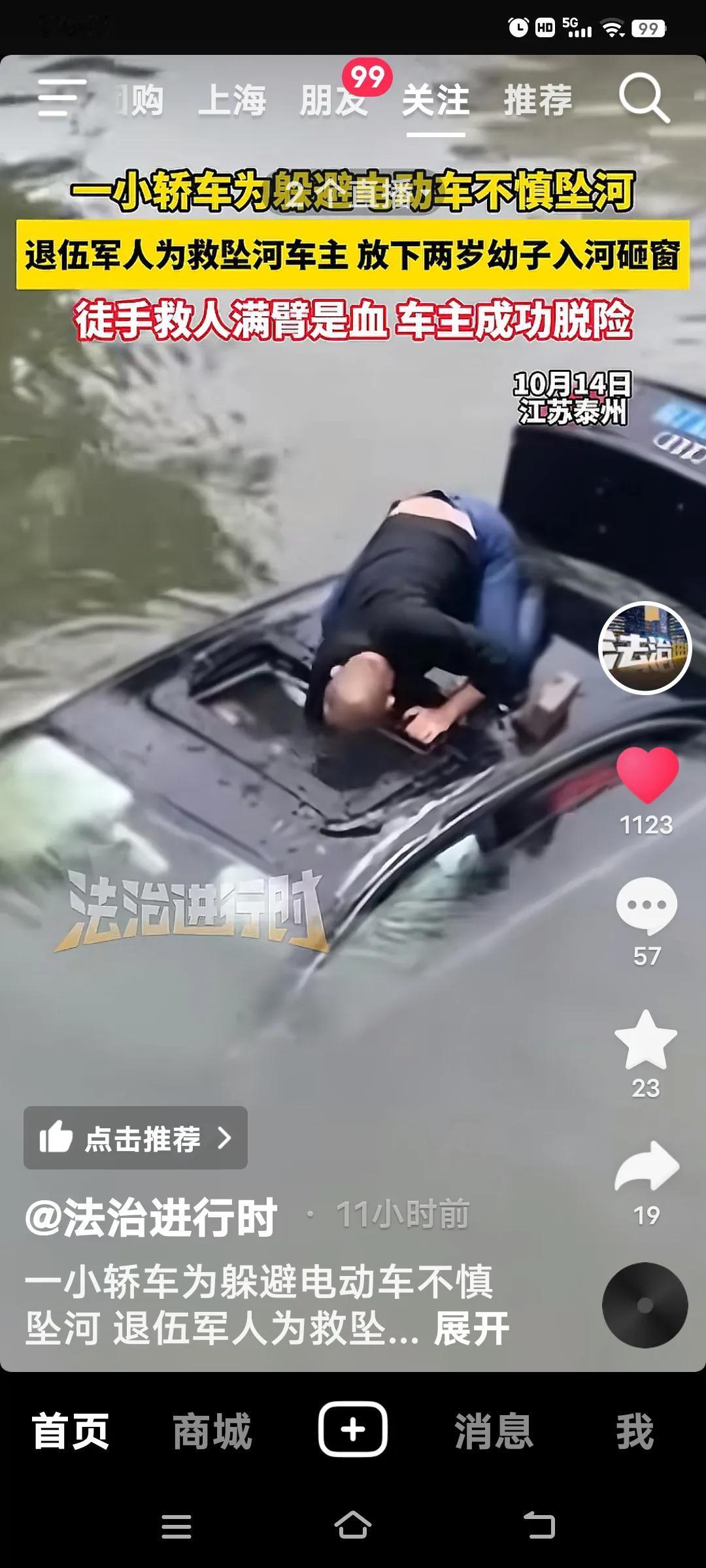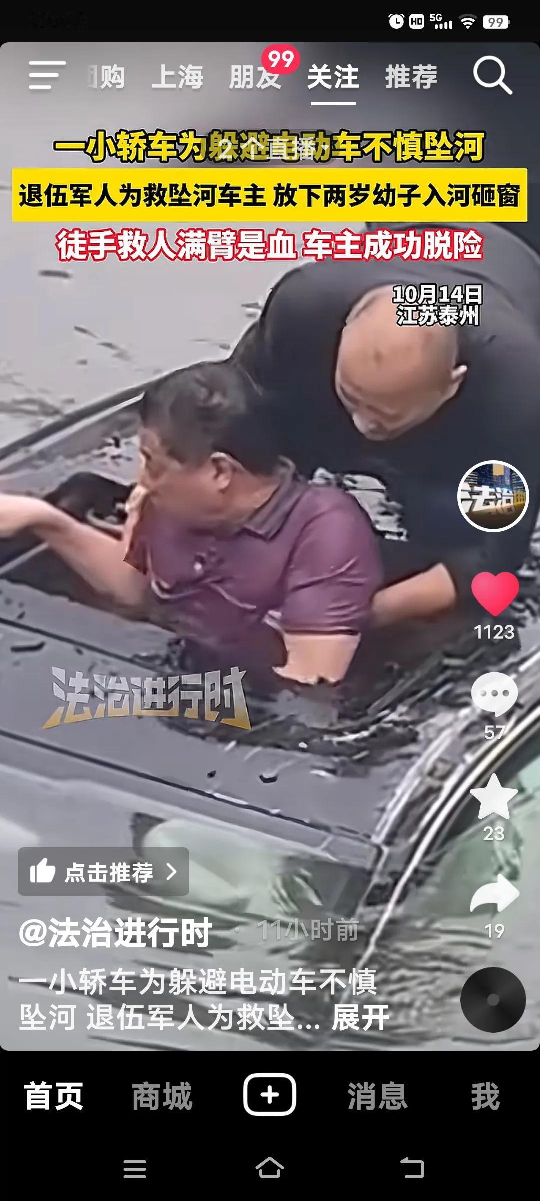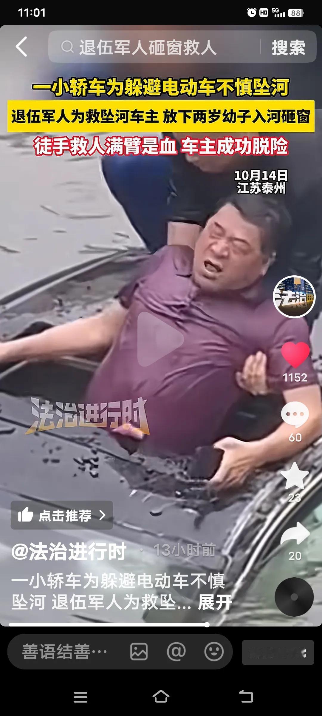 退伍军人总是在危急时刻展现出非凡的英勇。10月14日江苏泰州一辆小轿车为躲电动车不慎坠河,退伍军人不顾自己的身体,跳下河去砸窗救人。甚至还放下自己两岁的幼子。 像这种精神有多高尚呀!军人徒手救人满臂都是血。落水司机也是好样的呀,看到军人把他抱起露出水面时手里还握着手机呢!还真是个用心的人。虚惊一场呀!这第二次生命是退伍军人给的,必须牢记一辈子呀! 还好二人都平安无事,这让大家弦了 的心都松了一口气,开心啊[赞]舍身救人事迹 青年舍身救人 军人勇救落水人 军人救人