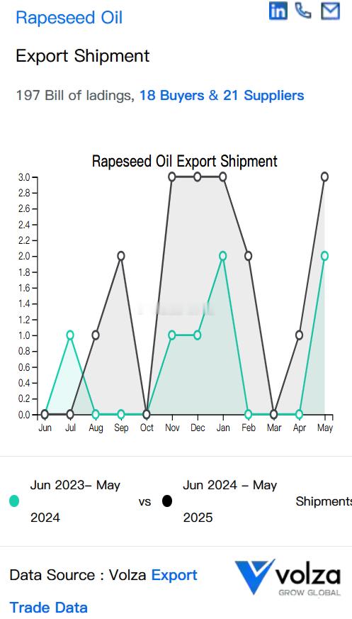 根据中国海关数据,中国今年前8个月对美国出口相关食用油及产品数量有限,金额不足40万美元。另据Volza海关数据,2024年6月至2025年5月,中国对美国出口仅18批次精炼菜籽油,主要用于食品加工企业试单,总金额不足百万美元。