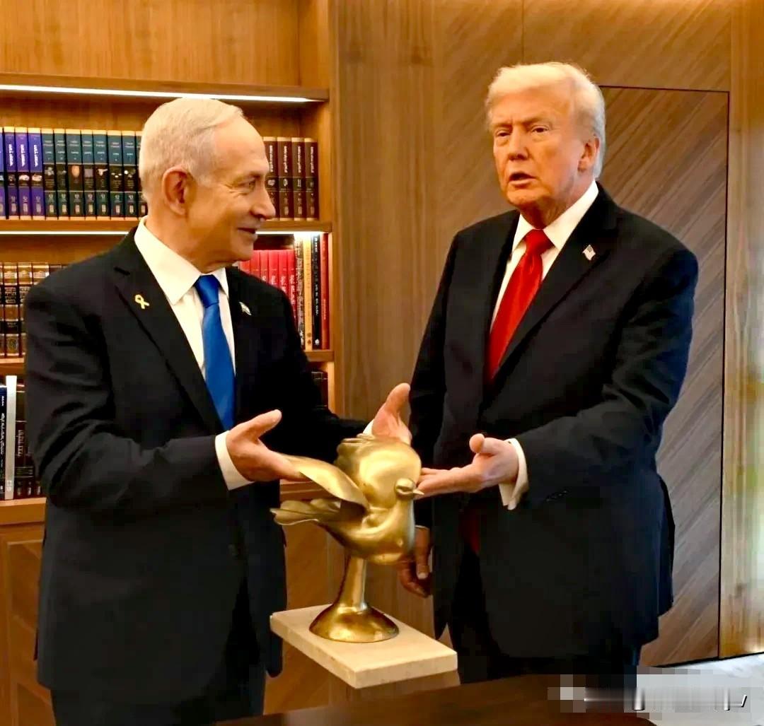 内胡是懂“懂王”的! 懂王心心念的诺 贝 尔 和 平奖旁落他家。 心中别提有多大失落感了。 于是,内胡就想了个办法: 授予懂王“以色列特殊贡献奖”! 请懂王到以色列领奖并演讲。 懂王看到这只黄金铸成的“和平鸽”心中窃喜: 这可比诺贝尔值钱多了! 这下好了,“名利”双收。 唉!知子莫若父啊! 可是,当他再次抚摸金鸽子时,突然郁闷了: 这是要放我鸽子呀? 善变的川普! 人们为什么把川普称作“懂王”