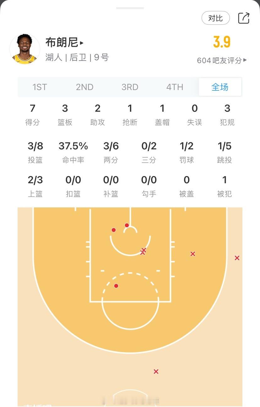 核武器!布朗尼出战22分钟,全场8中3得到7分,正负值-24断层第一。湖人vs太