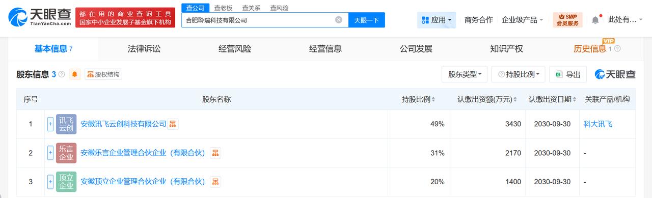科大讯飞等成立新科技公司注册资本7000万 天眼查工商信息显示,近日,合肥聆瑞科