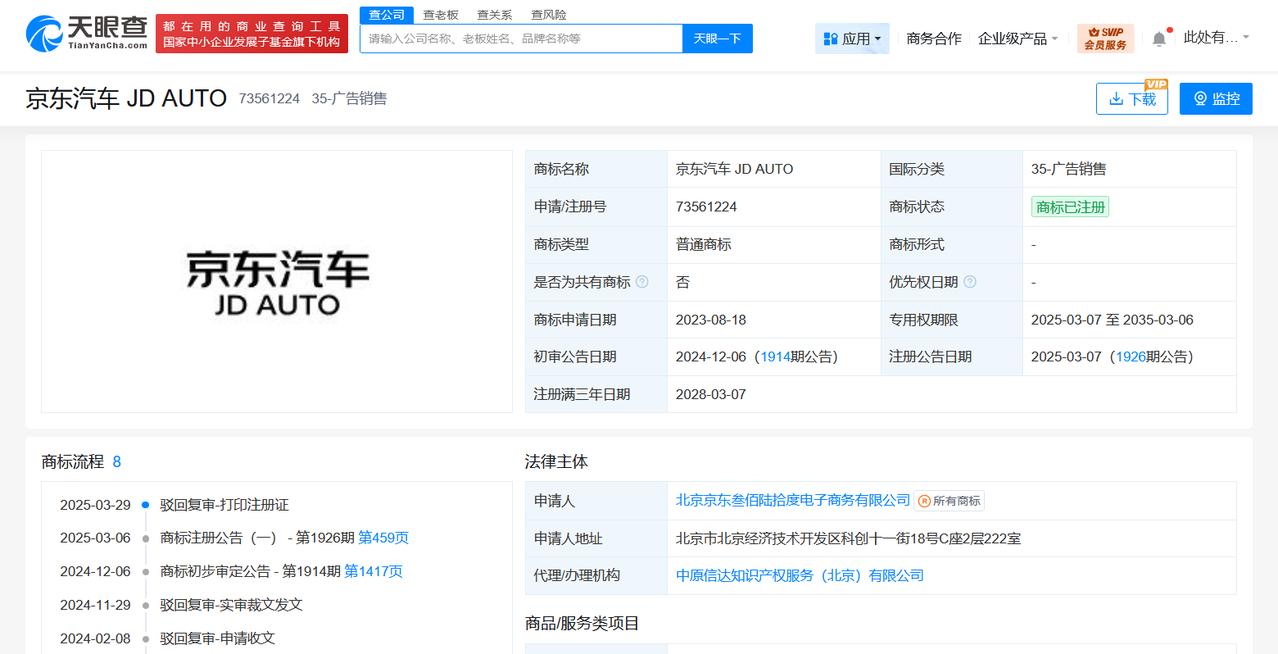 京东已注册多枚京东汽车商标 京东汽车商标已成功注册京东造车 据媒体报道,2025