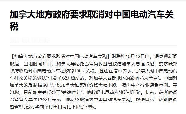 当地时间10月11日,加拿大马尼托巴省省长基纽致信加拿大总理卡尼,要求联邦政府取消对中国电动汽车征收的100%关税。 说白了,这事儿背后全是真金白银的经济账。就拿马尼托巴省来说,这个加拿大的交通枢纽,汽车零部件产业占全省GDP的12%,妥妥的经济顶梁柱。 可自打2024年加拿大跟着美国对中国电动车加征100%关税后,该省汽车配件厂订单量直接暴跌40%,不少工人连下个月的房贷都快还不上了。这日子能好过吗? 要知道,在关税实施前的2023年,加拿大从中国进口的电动汽车数量暴涨460%,达到44356辆,其中光是特斯拉上海工厂出口到加拿大的ModelY就占了相当大的比例。那时候,加拿大的汽车经销商笑得合不拢嘴,消费者也能花更少的钱买到高性能电动车。 可谁能想到,加拿大政府一拍脑袋,说加税就加税,结果直接把自己的市场给玩崩了。2024年关税实施后,中国电动车对加拿大的出口量从8月份的8972辆直线下滑到12月份的100辆,几乎归零。 有人可能会问,加拿大不是在大力发展本土电动车产业吗?大众、本田这些车企都在加拿大建厂生产电动车和电池,难道还怕中国竞争?可现实很骨感。 加拿大虽然投入了数百亿美元支持本土产业,但汽车供应链高度依赖美国,80%的零部件和整车销售额都来自对美出口。美国那边对中国电动车加征关税后,加拿大车企从中国进口电池和零部件的成本大幅上升,导致在美销售的汽车价格竞争力下降。 更搞笑的是,美国自己都开始对加拿大的奶制品和木材动起了关税的歪脑筋,这让加拿大车企腹背受敌,简直是“赔了夫人又折兵”。 农业这边的情况也不乐观,中国的反制措施更是让加拿大西部省份叫苦不迭。萨斯喀彻温省是加拿大最大的油菜籽生产省,2025年8月对华出口额同比暴跌76%,从去年的数亿美元直接缩水到9600万加元。 要知道,中国曾是该省第二大农产品出口目的地,这一下跌直接让当地4万名种植户人均损失数万美元,不少农场主不得不低价抛售牛羊来维持生计。 马尼托巴省的猪肉生产商更惨,一家企业每年就要承受1900万加元的损失,相当于每天烧掉5万多加元。这种“杀敌一千,自损八百”的操作,加拿大政府难道就没算过账吗? 更有意思的是,加拿大国内的民意也在发生微妙变化。去年还有63%的民众支持对华电动车加税,如今支持率已经跌到44%,反对者占比反而升到47%。老百姓可不是傻子,他们发现关税不仅让自己买不到便宜的中国电动车,还要为加拿大政府的政治决策买单。 以前花3万加元就能买到的特斯拉ModelY,现在加上关税后价格飙升到6万加元,普通家庭根本买不起。而本土生产的电动车要么价格高得离谱,要么续航里程短得可怜,消费者只能无奈地摇摇头,选择继续开燃油车。 地方政府的反弹声浪更是一浪高过一浪。除了马尼托巴省省长基纽,萨斯喀彻温省省长莫伊也公开呼吁取消对华关税,并亲自率团访华,试图推动中方取消油菜籽进口关税。这些地方大员心里清楚,再这么耗下去,自己的政治前途都要搭进去。 毕竟选民关心的不是什么“战略竞争”,而是兜里的钱袋子鼓不鼓。马尼托巴省议会甚至通过了一项决议,要求联邦政府赔偿因关税导致的经济损失,否则将拒绝执行联邦的部分政策。这种“地方先行”的策略,让联邦政府陷入了前所未有的尴尬境地。 事实上,加拿大政府已经开始悄悄松口。财政部宣布允许企业申请暂时减免进口中国电动汽车、钢铁和铝产品的关税,理由是“帮助企业调整供应链”。这就好比一个人被掐住脖子快喘不过气了,终于肯松开一点手。 说到底,这就是一场没有赢家的关税战。加拿大政府为了配合美国的“战略竞争”,不惜牺牲本国企业和民众的利益,结果换来的却是经济衰退、民意流失和地方政府的反抗。而中国则用实际行动证明,任何单边歧视性关税都不会得逞,只会搬起石头砸自己的脚。 毕竟,在全球化时代,合作共赢才是硬道理,搞贸易保护主义只会被时代抛弃。