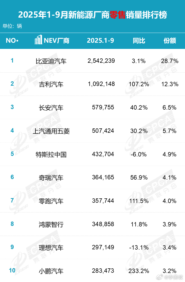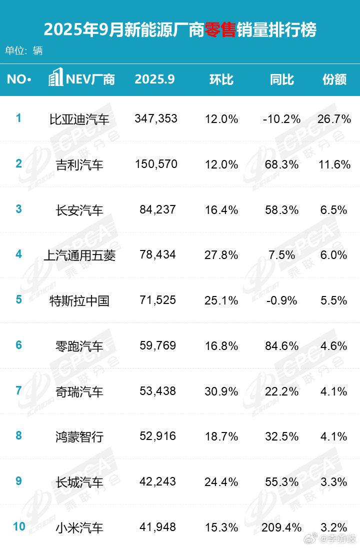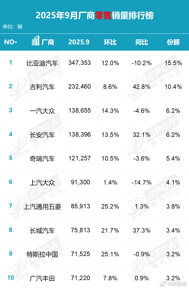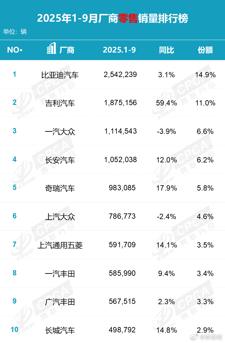 9月、1-9月汽车厂商销量榜/新能源汽车厂商销量榜出炉!吉利汽车销量同比大增,新能源汽车月销超4万辆才能进入前十,竞争越来越激烈了,淘汰赛加速到来!