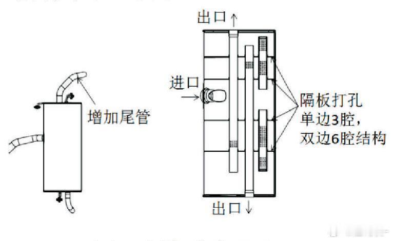 那就得在极限的体积下充分优化消声能力,主消声器增加一个排气口,做双出排气不仅是为了好看。相对应的在消声器里面还会增加几片隔板,隔出第二组扩张腔,与双出排气形成两组消声结构。