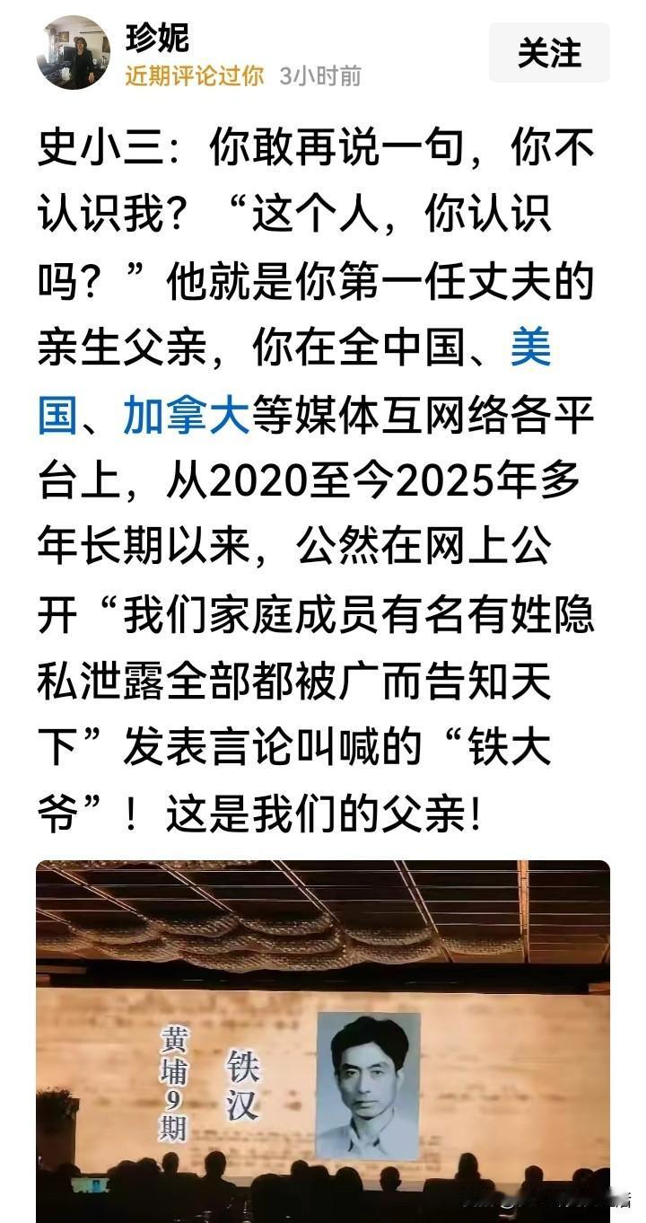 自称史晓燕前夫姐姐的人,一直在网上对她的“诽谤”行为强烈抗议,同时也曝光了史晓燕婚内出轨等一些不堪的过去。 今天更是直接晒出了史晓燕前公公的照片,是一位黄埔九期的军人,名字叫做铁汉。 好奇百度了一下,铁汉原名铁鼎恒,沈阳人,黄埔军校第九期毕业生。 史晓燕前一阶段曾经否认认识这位网名为珍妮的女士,说这是蹭流量的。 大家自己判断一下,谁是真谁是假?