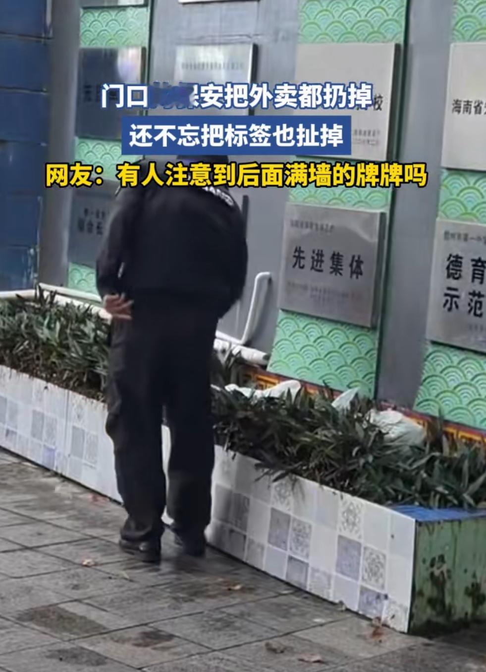 这个保安厉害了,把门口外卖全都扔到了花带中,还不忘把外卖标签扯掉。 网友根据视频里墙面上的字和门口牌匾扒出,事发地是海南省儋州市第一中学,据说还是当地的重点高中。 先别急着骂保安,思考一下,谁会闲着没事乱扔别人的外卖,还要毁掉订单信息,保安一月多少工资,敢这么大胆应该也只为保住自己饭碗。 外卖触及到了食堂承包者利益,最根本还是触及到了学校的经济利益,因为食堂承包费用招标竟价时费用抬的非常高,如果大家要骂的话,应该再深挖一下,不要盲目跟风把矛头指向保安。 一般来说,重点高中里的伙食不会差到哪去,学校不让学生点外卖,是怕食品安全问题,学生一旦出事,学校是要担责的,因此点外卖和吃食堂很难平衡,别说学生了,老师也有点外卖的。 当前视频已经在网络发酵,预测一下结局:据调查网传视频属实,该保安是临时工,现已解聘处理… 学校保安扔外卖校方该担责吗 学校为食品安全扔外卖合理吗 为什么保安喜欢刁难外卖员?