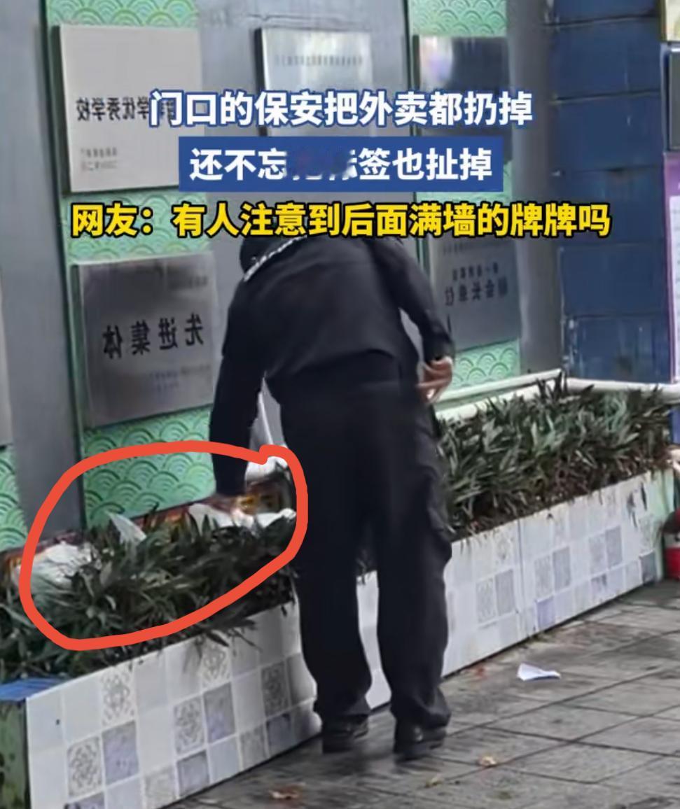 这个保安厉害了,把门口外卖全都扔到了花带中,还不忘把外卖标签扯掉。 网友根据视