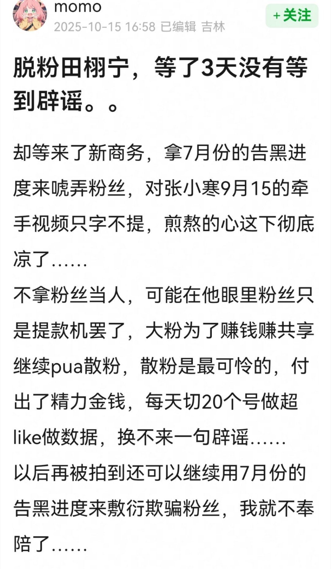 又一个田栩宁粉丝脱粉了。。还有氪金记录。