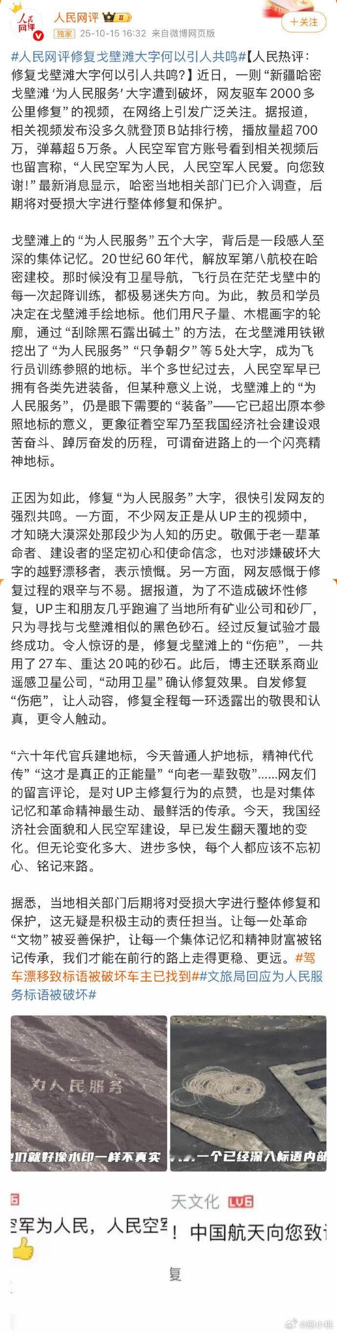 人民网评修复戈壁滩大字何以引人共鸣 半个多世纪过去,人民空军已拥有先进装备,但戈壁滩上的这几个字早已成为精神象征,网友修复它,本质是在守护这份珍贵初心。