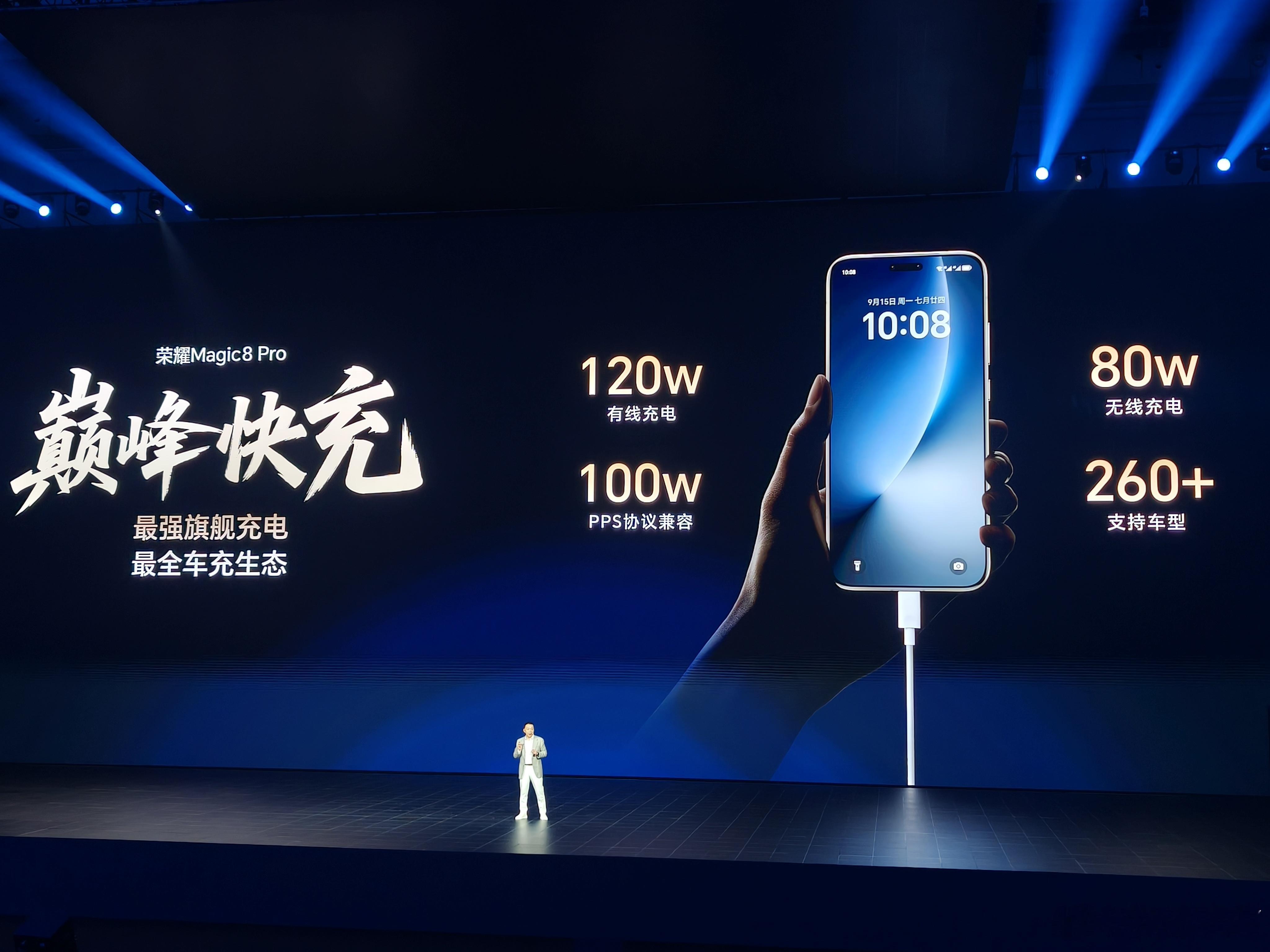 在充电方面,Magic8系列追求极致体验:行业最强120W有线 + 80W无线快充,兼容100W PPS协议,支持超过260家的车充生态,用电脑充电器也可快速充电。