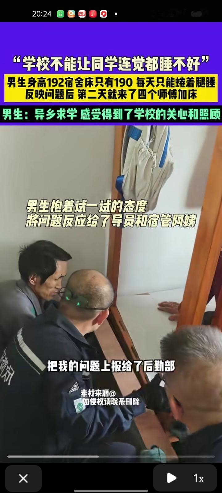 10月14日,山西晋中。男生身高192,而宿舍的床只有190米,每天只能蜷着腿睡。他抱着试一试的态度,将问题反映给后勤部和宿管阿姨,第二天就来了四个师傅加长床铺,没有耽误午休时间。 白同学表示,在他申请加长床铺的过程中,公寓中心的王主任对他说:“孩子,咱们学校不能让学生连觉都睡不好”