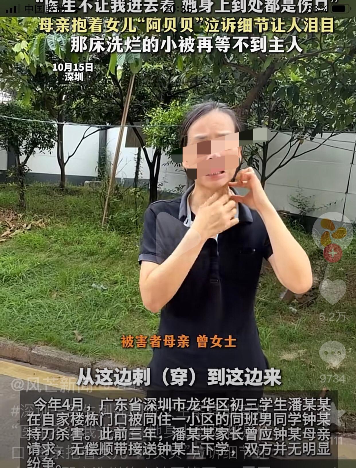 18岁凶手下跪求饶! 现在知道怕了吧 虽说未成年(犯案时15岁)不足处以极刑,看过报道,太凶残了,一次没成回头再补刀,这么小还真下得了手。 虽说是同一小区,受害女生母亲说,他们和凶手父母联系很少,凶手母亲来过她家几次,只是感谢她帮忙接送孩子。从小区到就读的中学,开车需10多分钟,走路约半个小时。接送了凶手和他姐姐近三年,三年无偿帮忙接送,到头来却引祸上身,太冤了。(来源:新闻夜航) 之前有河北邯郸,这次是深圳!这些学生干出的事已经超出想象,这类案件一定要公开,不然后续还不知道会有怎样的人出现。