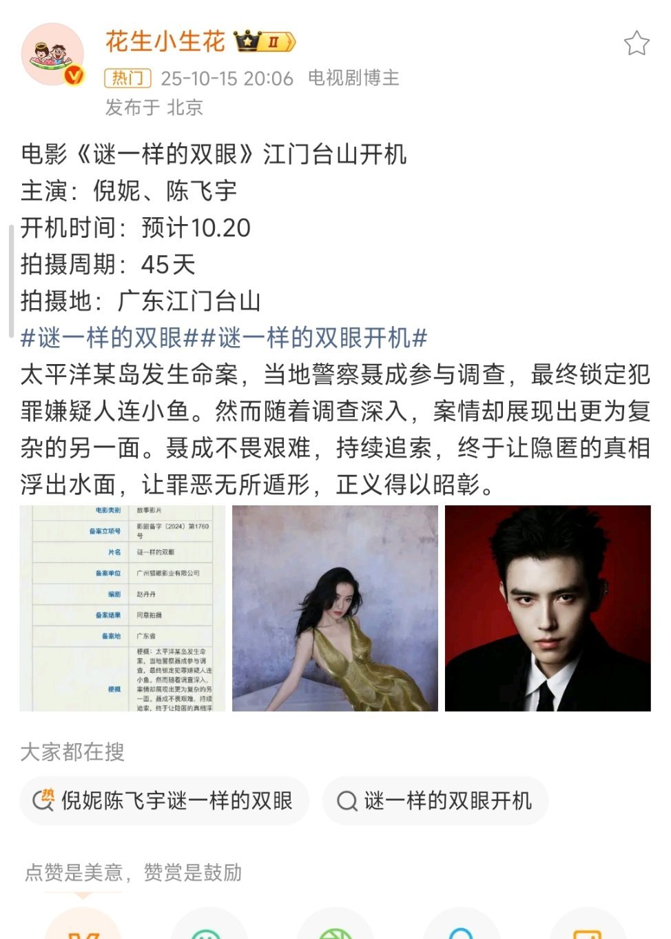 🍉悬疑电影《谜一样的双眼》倪妮陈飞宇,即将开机 ,这对组合看起来怎么样?