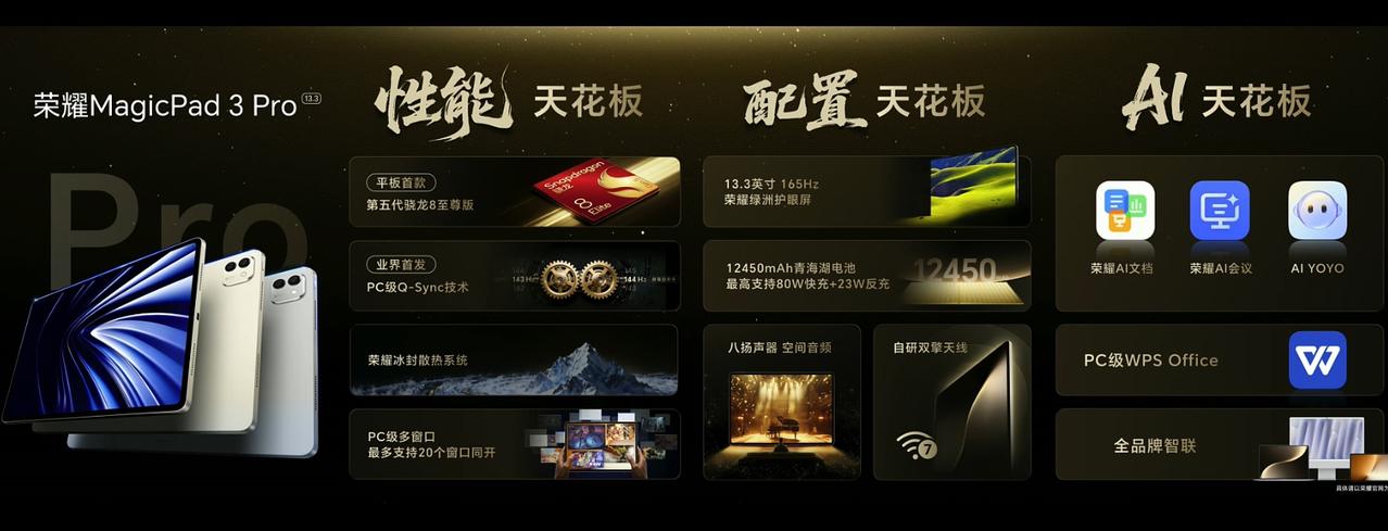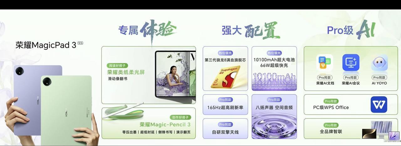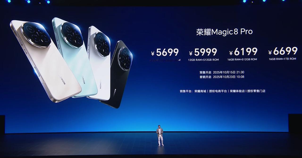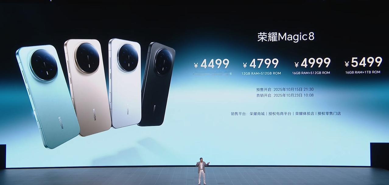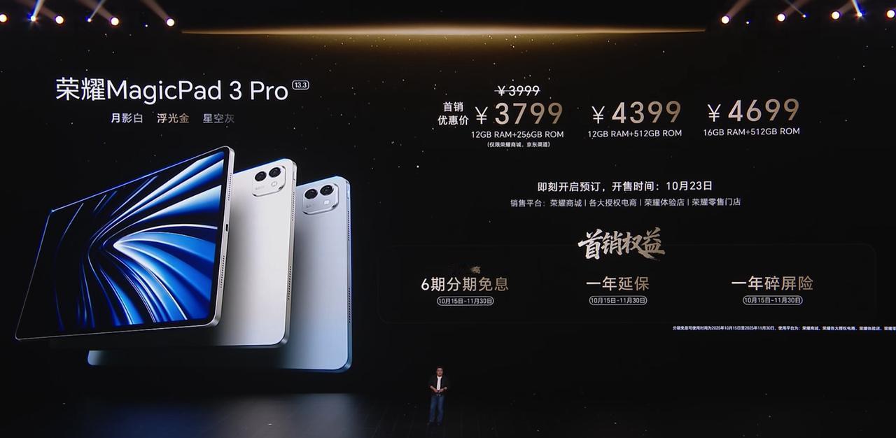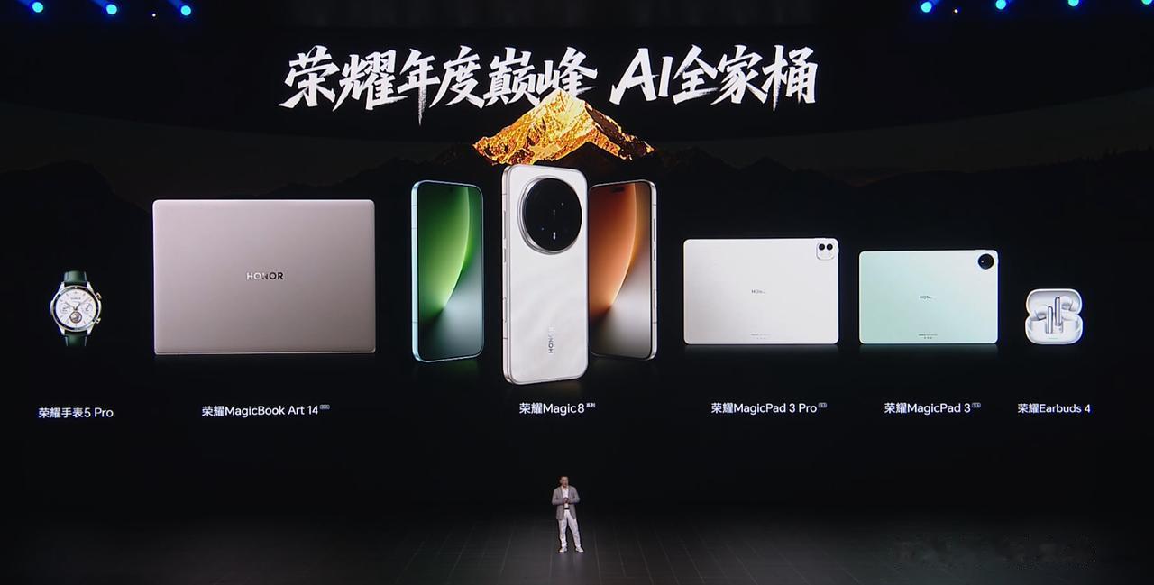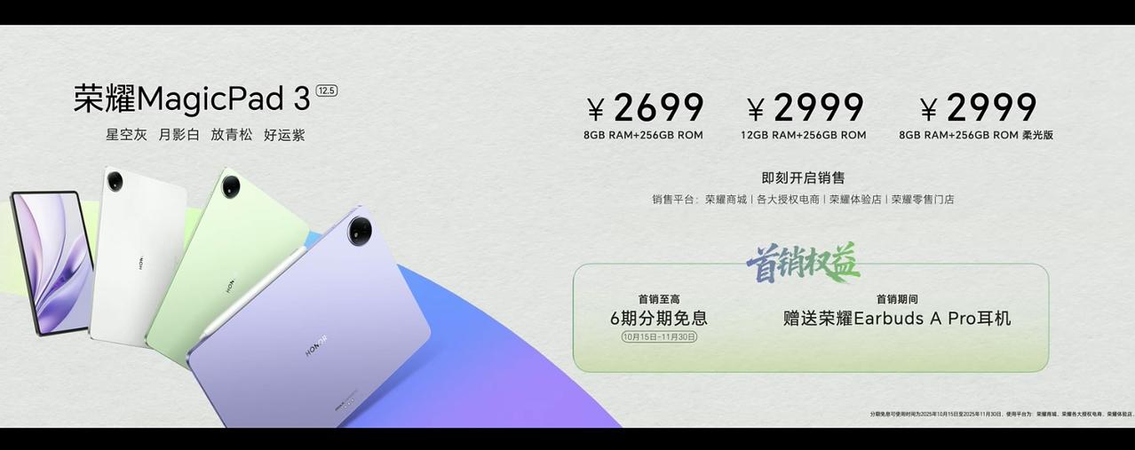 荣耀Magic8价格 12+256 4499 12+512 4799 16+512 4999 荣耀Magic8 Pro价格 12+256 5699 12+512 5999 16+512 6199 16+1T 6699 荣耀MagicPad 3 Pro 第五代骁龙8至尊版移动平台 13.3英寸3.2K分辨率LCD屏 7档可调165hz刷新率 12450毫安时电池 12+256 3799 12+512 4399 16+512 4699 荣耀MagicPad 3 12.5寸 8+256 2699 12+256 2999 8+256柔光版2999 荣耀手表5 Pro:1599-1899 荣耀Earbuds 4:399 荣耀亲选KUMI AI Note:699