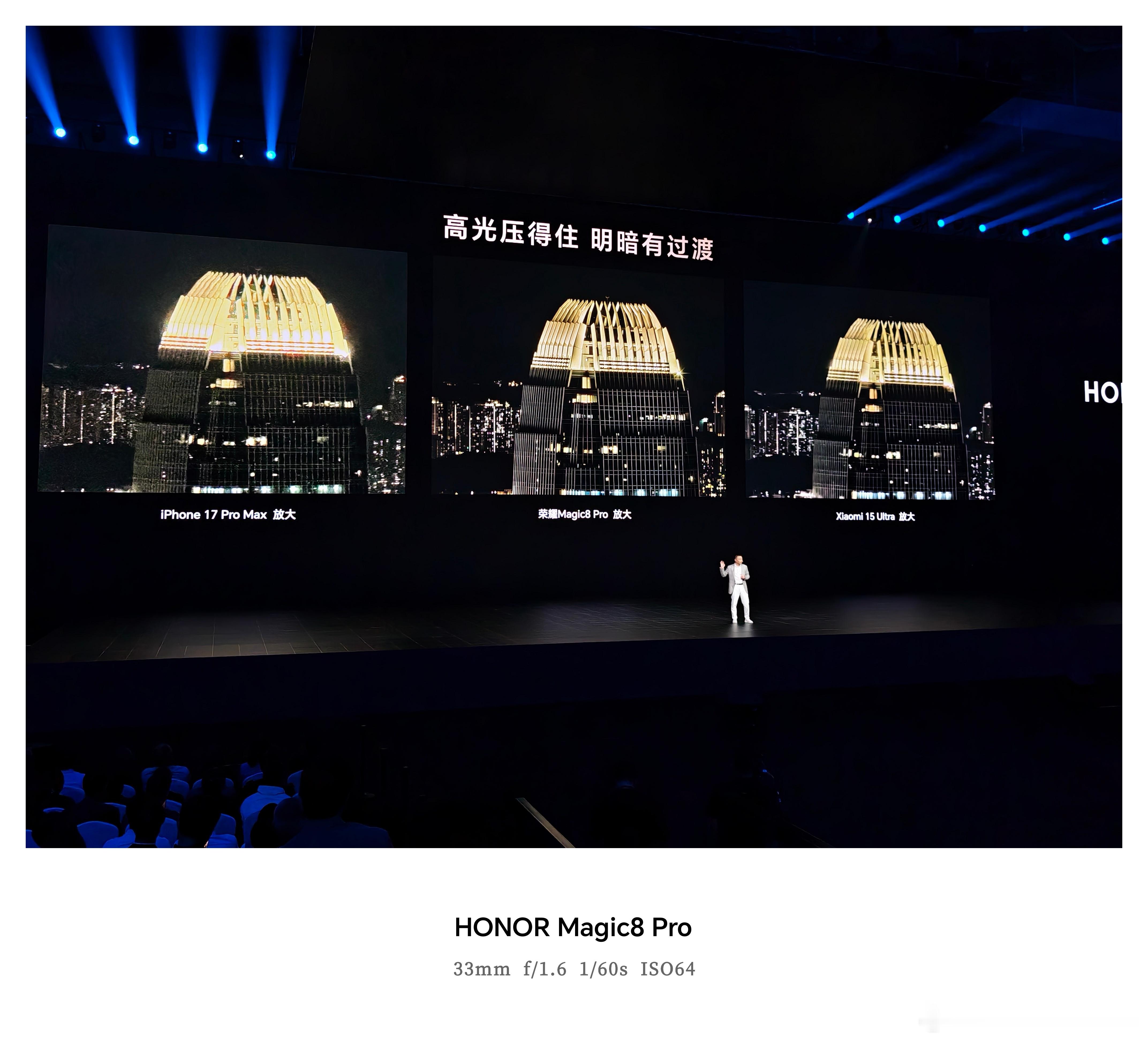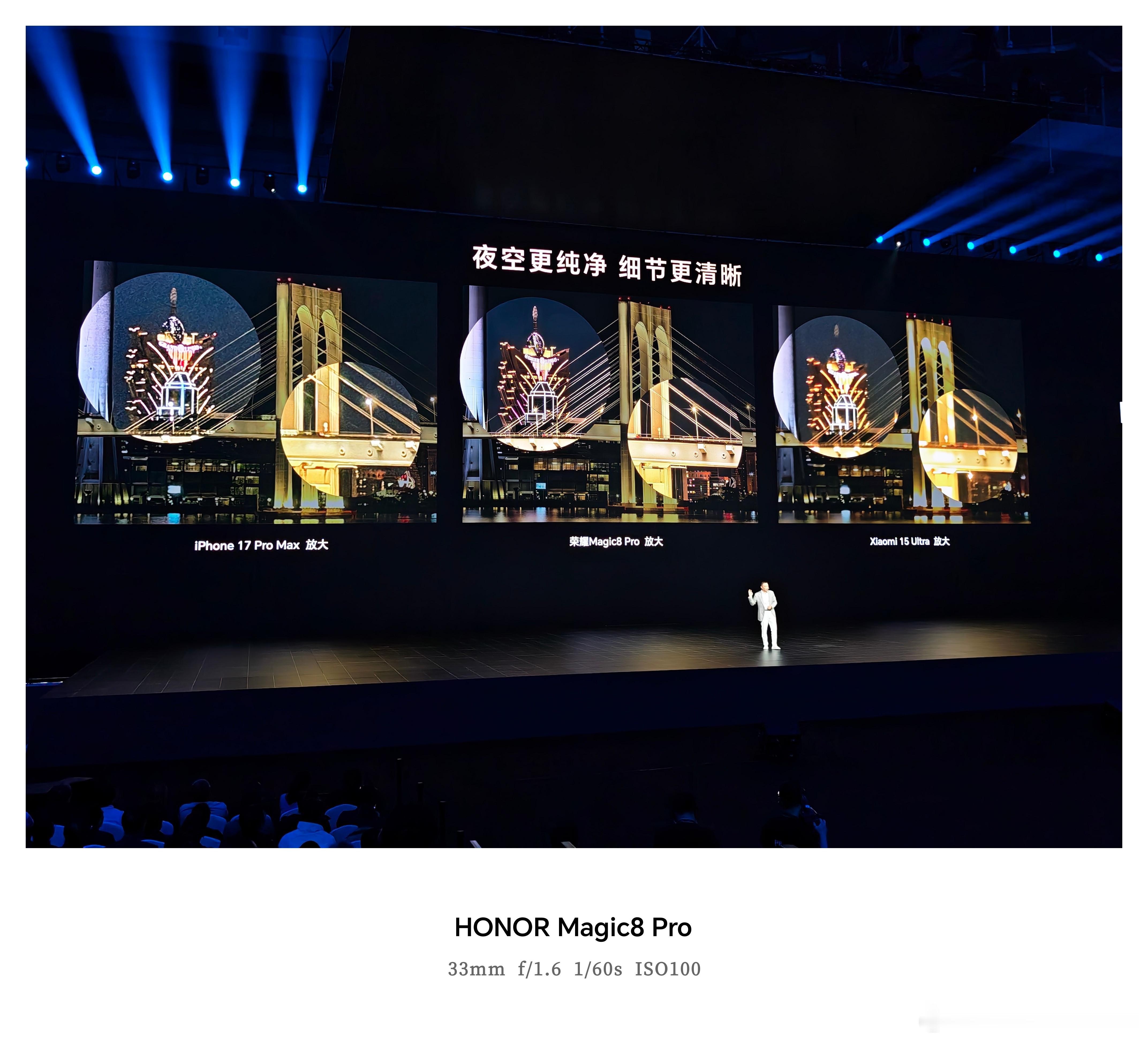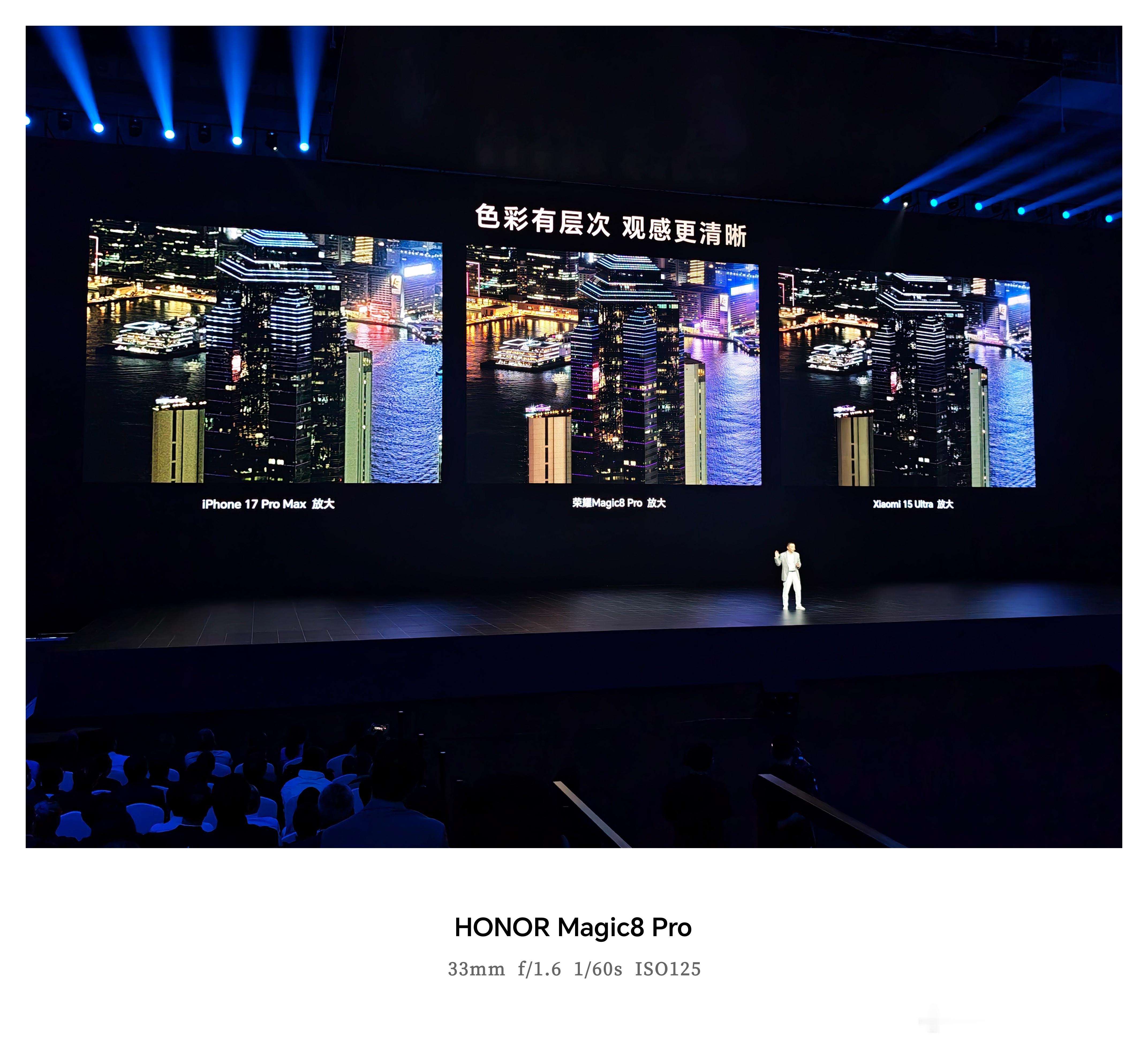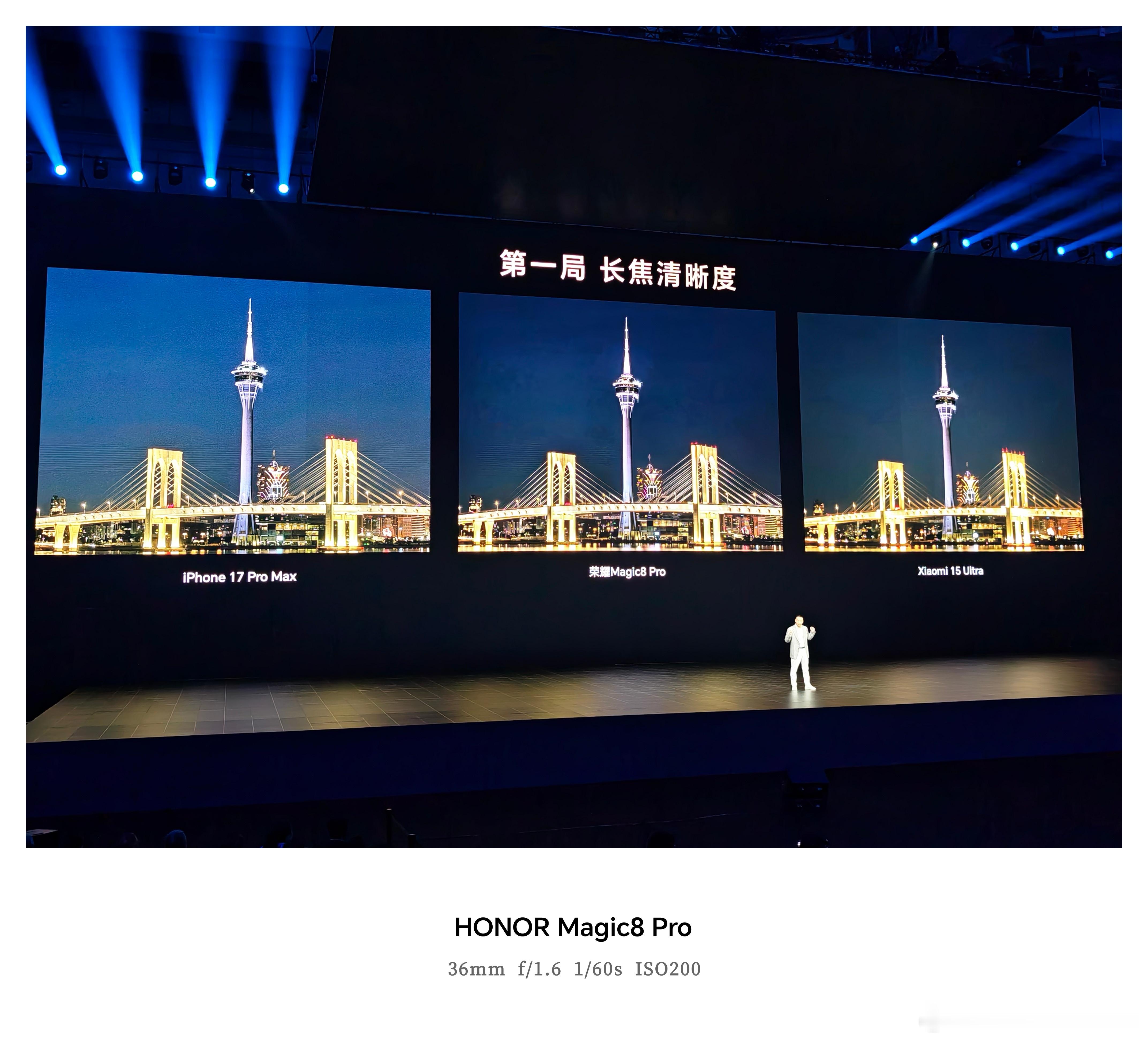 今晚,荣耀火力全开啊。荣耀Magic8系列发布会现场,直接对比苹果iPhone17 Pro Max和小米15 Ultra,夜景长焦的PPT连着对线,一张接着一张。