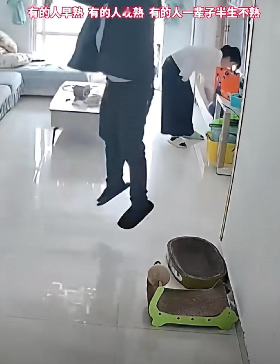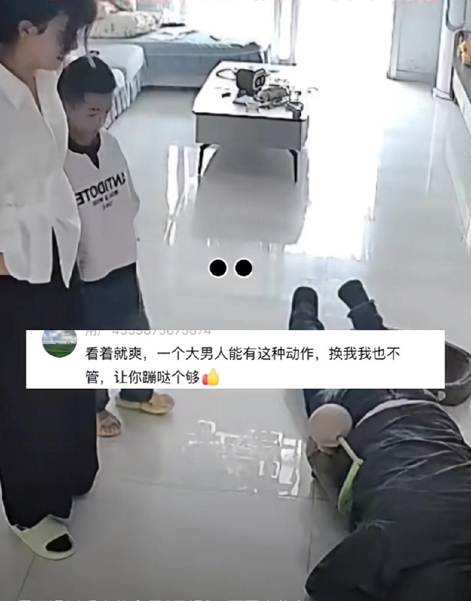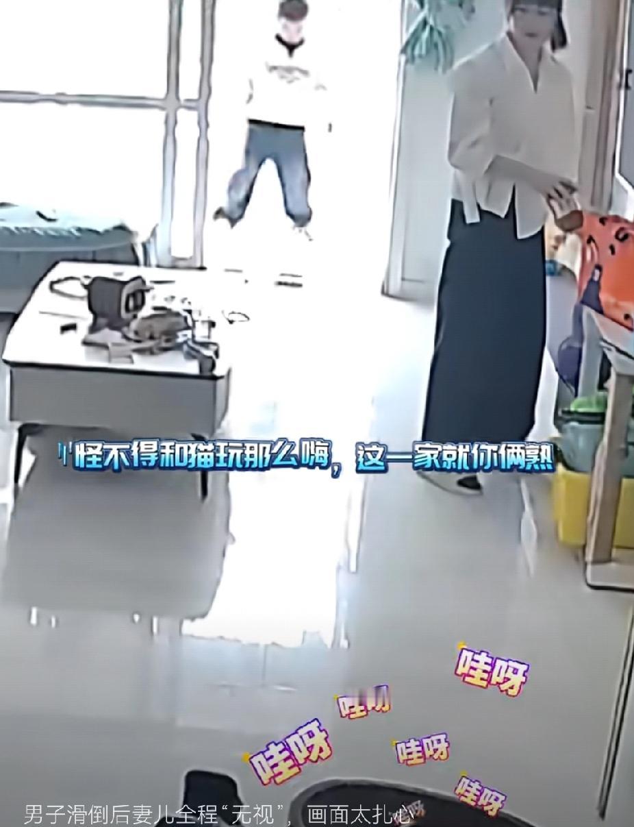 有点扎心!男子摔倒妻儿全程无视!10月14日,安徽一男子抱着家中猫咪举高高,还越蹦越高,结果一个不小心就摔倒在地。 正在做家务的妻子和在阳台晾衣服的儿子看到男人摔倒,盯着看了两秒钟,就各自忙各自的了,好像男人不是这个家庭的一份子。 猫也被这突如其来的事故吓得逃之夭夭,男人明显被摔懵了,趴在地上起不来。这时妻子和儿子走过来,齐整整地站在男人身边,静静地看着男子趴在地上。 真的是太扎心了!家里的顶梁柱摔倒了,都没有人关心一下,更没有人扶一下。 却有网友说:“如果我家男人这样蹦蹦跳跳在家作妖,摔倒了我也不管他!” 其实网友说的也对,毕竟妻子和儿子都在做家务,而男人却闲来无事开始逗猫。眼里没有一点活儿,说不定妻子和儿子早就嫌弃他了!对此,你怎么看呢?安徽 婚姻与家庭