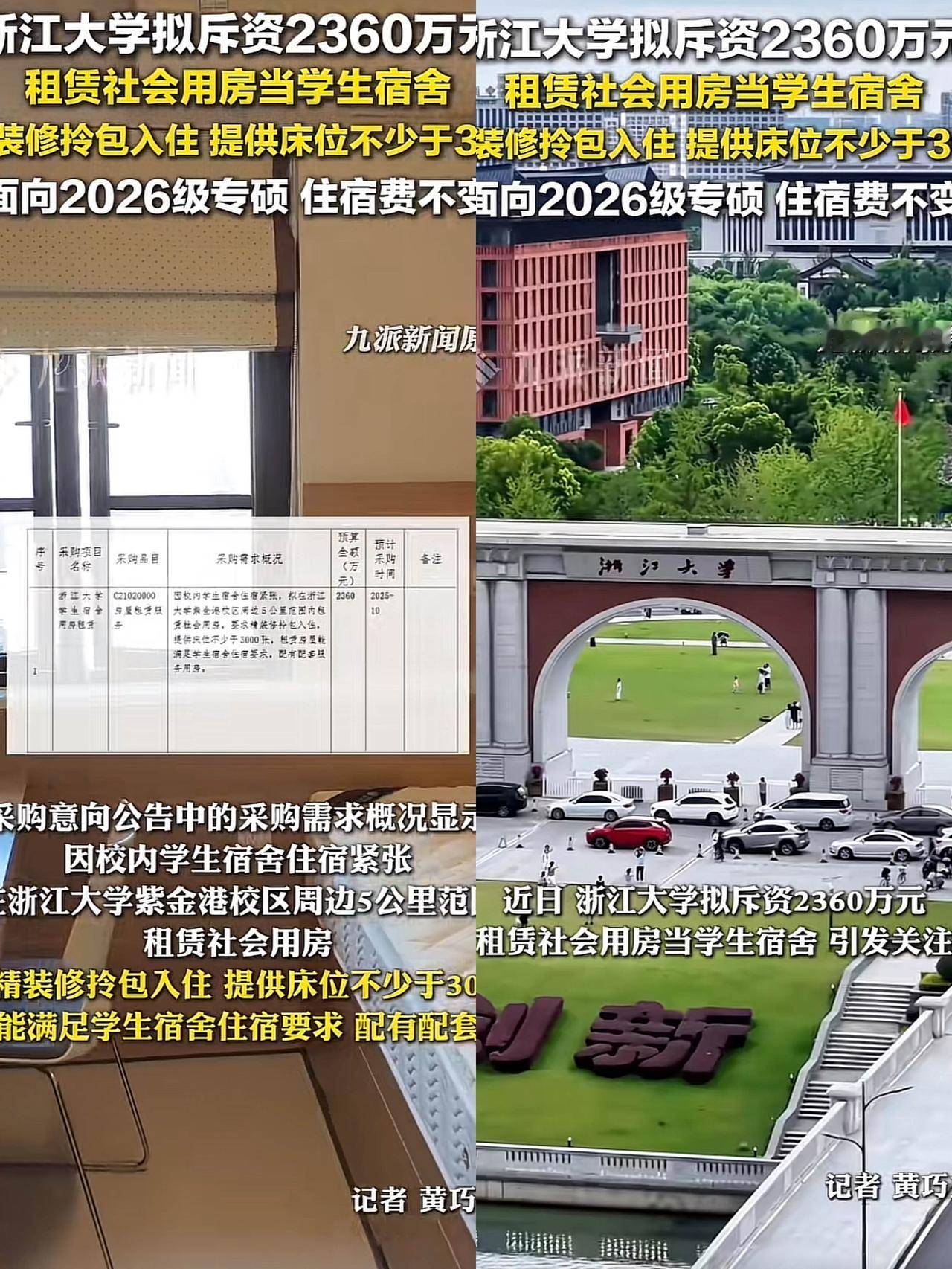 浙大终于打响了第一枪。 正式确定用2360万给学生租了一栋楼当宿舍,彻底迈出整改学生宿舍的第一步,很有纪念意义。 这笔钱是3年的租金,算下来每年约800万,租了200多套精装修房,每套住2-4人,人均成本比自己校外租房还低。 房子里有独立卫生间、空调和洗衣机,虽说比不了新建校内宿舍,但比老校区的旧宿舍强太多了。 有人吐槽“为啥不自己建”,可建宿舍耗时间又费钱,短期根本解决不了学生住宿难题。 浙大这招是“曲线救国”,先把学生的居住需求解决了,总比让大家挤在条件差的老宿舍里强。 而且学校补贴后价格比市场价低,摊到每个学生头上没多少钱,性价比其实很高! 这也是学校的无奈之举,短期能解决问题,大家觉得呢?