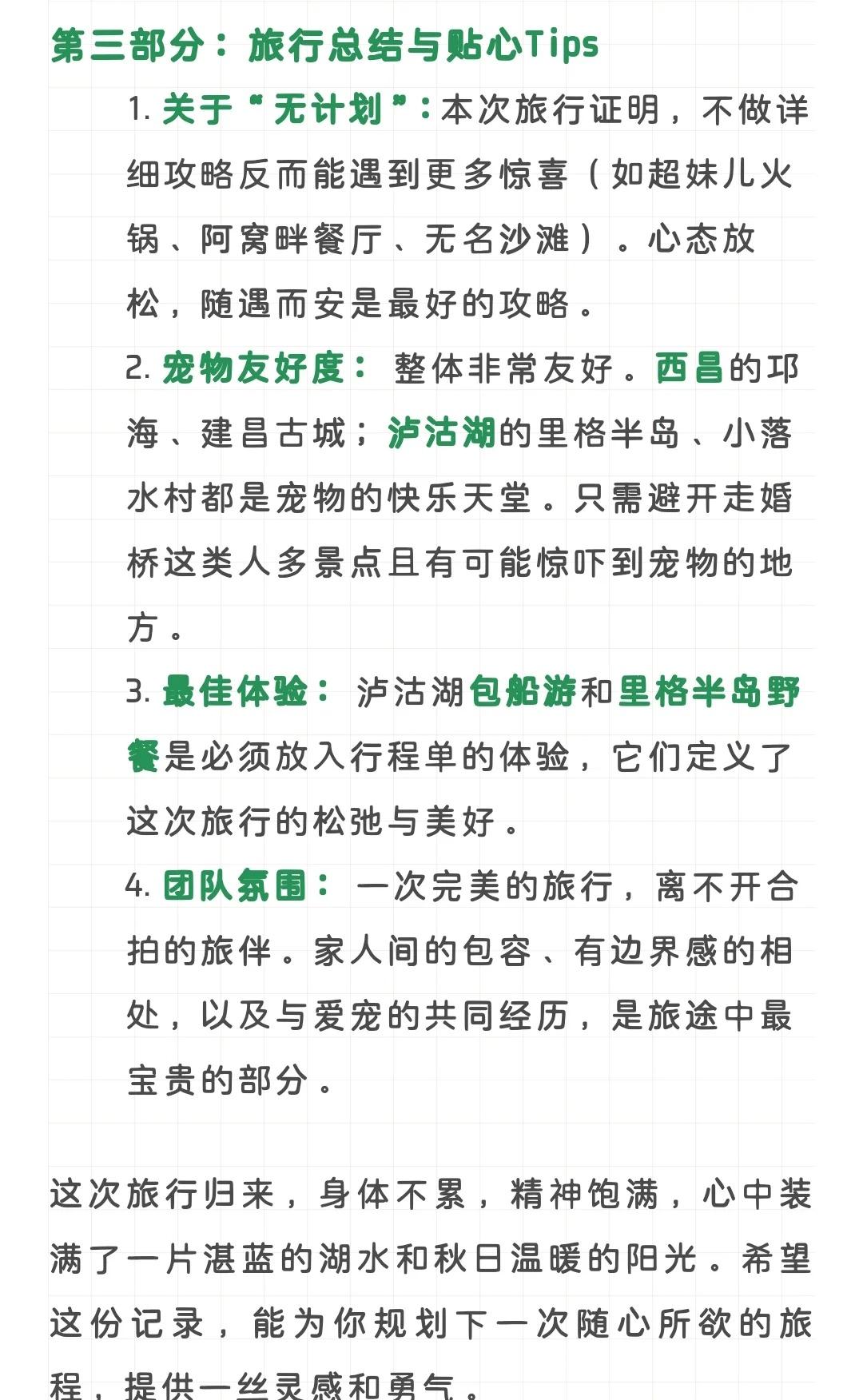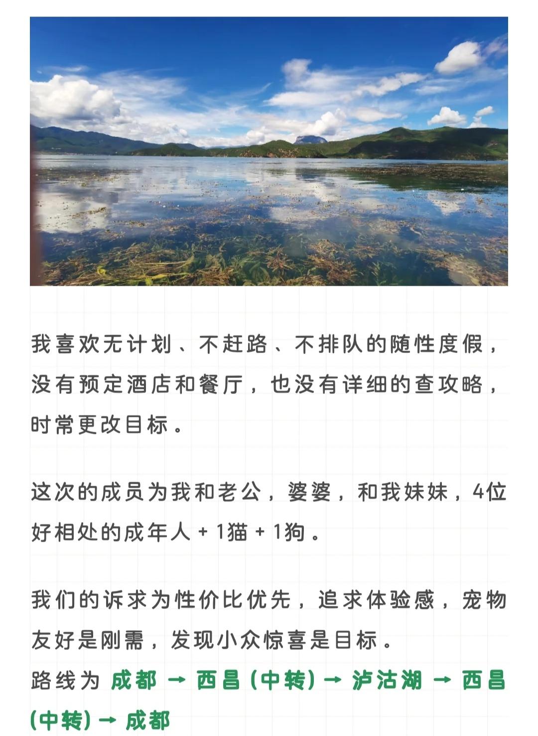 泸沽湖自驾七天六夜,带宠旅行花多少钱? 国庆节的时候从成都出发,经西昌,到泸沽湖。 全程无计划,无预定,非常随性的慢节奏的旅行。 但是泸沽湖真的值得! 宠物友好,性价比高,风景绝美! 上面的文章我会详细的记录我所有吃住游玩选择的地方, 并且写下我的感受和评价,以供大家参考~ 带着宠物去看世界 带狗看世界 带猫咪去旅行 带着毛孩子去旅行 快乐瞬间 人生的意义 泸沽湖旅游 西昌烧烤