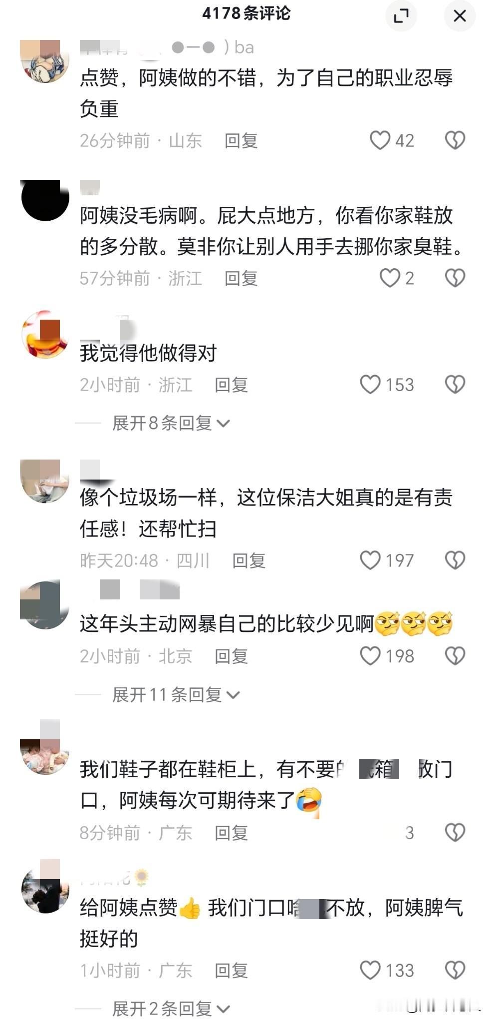 保洁阿姨用拖把清理小仙女放在楼道门口的鞋子,被小仙女挂网上,网友却没有上当,纷纷支持保洁阿姨! 有女子发现放在楼道门口的鞋子被人弄的乱七八糟的,看了监控发现是保洁阿姨在打扫卫生时用拖把将鞋子拨乱的。 于是,她就把保洁阿姨的行为挂网,结果评论区4000多留言,清一色支持保洁阿姨。 小仙女只能出来解释,她没有想网暴保洁阿姨的意思,是想提醒别人,不要和她一样,不把鞋子放鞋柜,要不然就会遇到同样的情况。 小仙女解释每个人看问题的角度不一样,但她喜欢挑喜欢的看[what] 说明她内心还是觉得保洁阿姨做的不对,不应该用脏拖把清理她漂亮干净的鞋子。 但清理楼道公共区域以及业主门口的卫生,是保洁阿姨的本职工作。 虽然小仙女的鞋子放她家门口,是不影响其他的住户,只是她的行为影响了保洁阿姨的工作。 保洁阿姨她一个人要打扫好几栋10~30多层的房子,如果很多业主都将鞋子放门口,会让阿姨的工作时间变长。 保洁阿姨要是放着鞋子下面的卫生不管,有业主看到门口脏有灰尘,也可能向物业投诉自己的楼道没有人去打扫,一有投诉保洁阿姨就会被物业责罚。