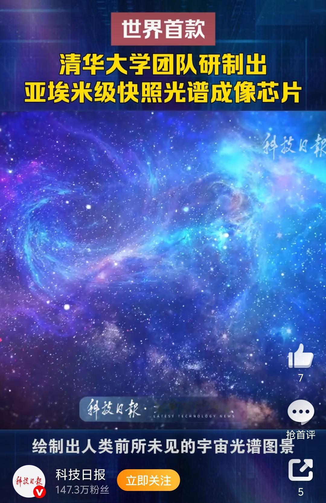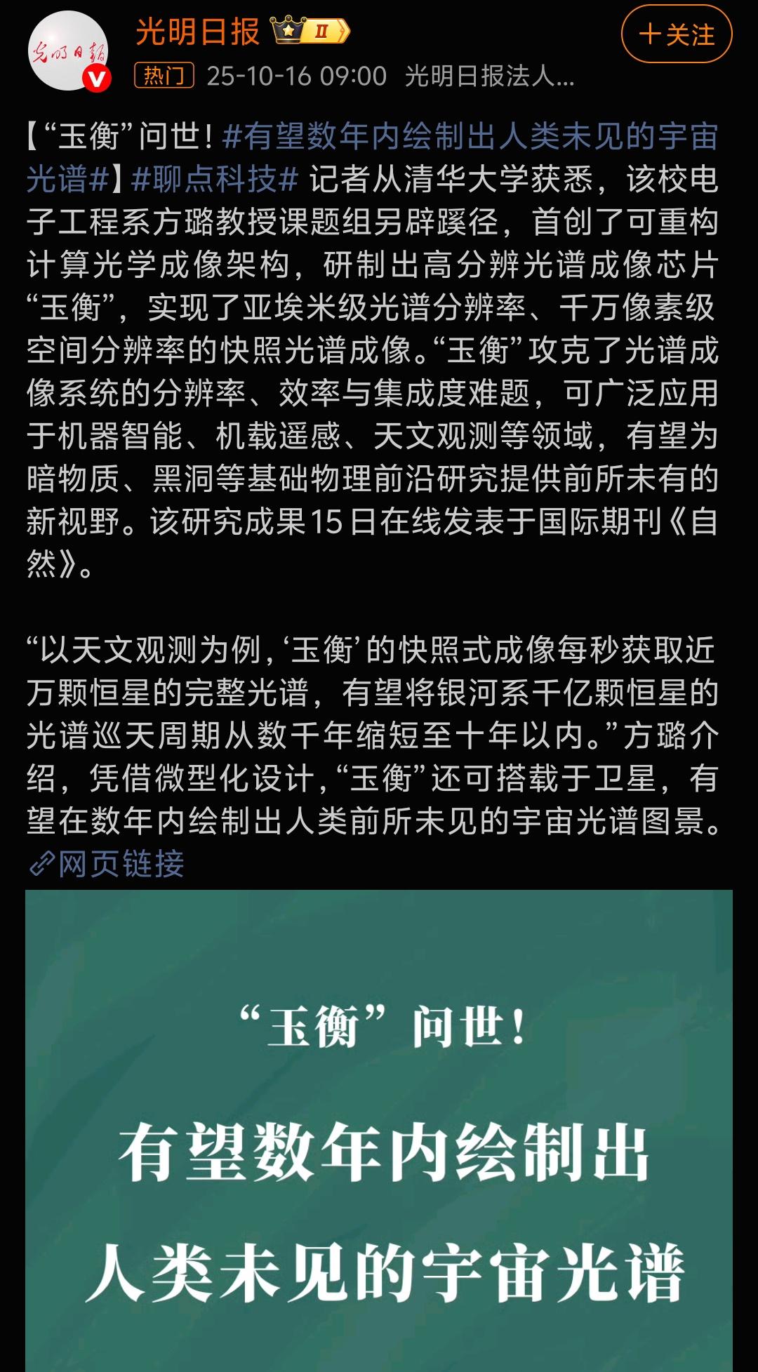 清华大学研制的高分辨光谱成像芯片“玉衡”引发科技圈震动,这个芯片可以干什么呢?文章说应用于机器智能、机载遥感、天文观测等领域,有望将银河系千亿颗恒星的光谱巡天周期从数千年缩短至十年以内。” 这么说好像离咱们普通生活挺远的,咱换个说法:它集成到可穿戴设备中,必然智能手表,无创监测血糖、血脂等关键生理指标,精度更高。把它当一个智能放大镜,它能发现分析细胞或皮肤的变化,对于皮肤病变早期发现有帮助。还可以直接看看食品中的成分,有没有细菌霉菌等,是不是真正的无糖食品,喝的酒是不是酒精勾兑还是纯粮食酒。 走进老百姓的生活那一天,也是生活智能化翻天覆地的一天。