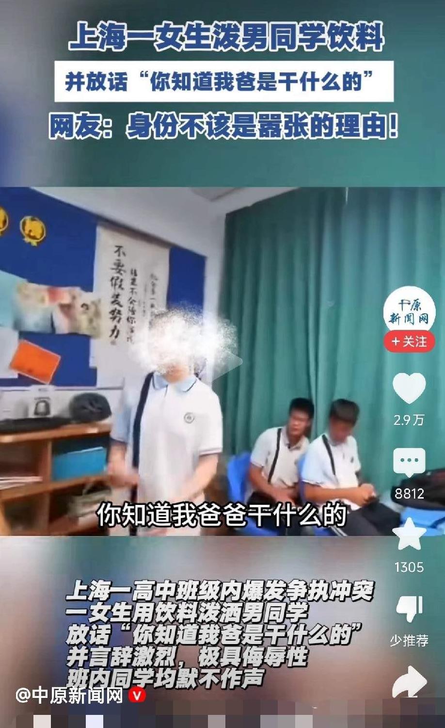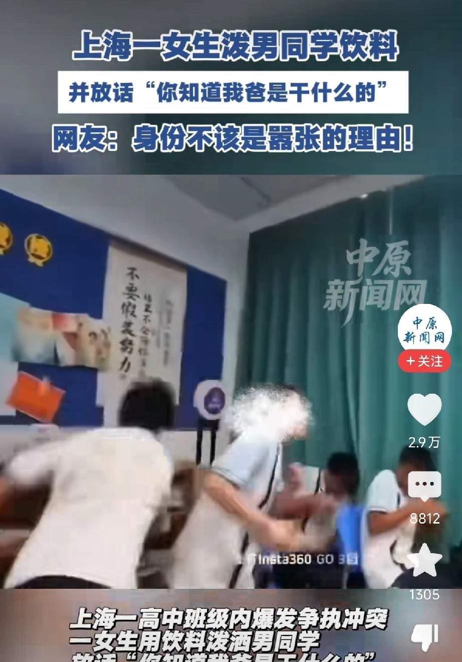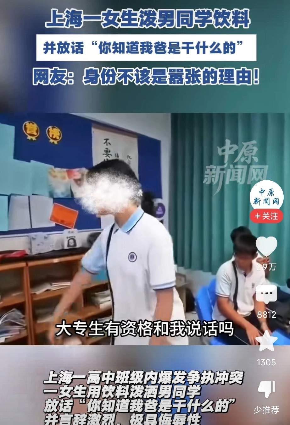 不管你爸是干什么的,也都不能往同学身上泼饮料吧? 刷到这样一个视频,上海一女生在教室里往男同学身上泼饮料,其实当看到这名女生,准备拿着饮料去泼男同学的时候,男同学的身上就已经有些湿了,这也说明了女生已经是泼过一次饮料了,而这名女生还觉得不够解气,于是又去拿了一瓶饮料,一边往男同学身上泼着饮料,一边羞辱着男生:“中考比我低三十几分,像你这样的中专大专生,有资格跟我说话吗?”,这名女生在泼完饮料后,甚至还随手将空的饮料瓶,用力的砸在了男同学的身上! 就在这名女生,往男同学身上泼饮料的时候,教室里还有很多同学,可是却没有一个同学,上前去阻止这名女生往男同学身上泼饮料,而被泼饮料的男同学,全程也没有说过一句话,表现的是非常的克制! 看到被泼饮料的男同学,身上的衣服几乎已经湿透,本以为这名女生的气也就消了,可是让人无语的是,这名女生看到男同学并没有说话,也没有反抗,可能心里觉得更来气了,又去拿了一瓶可乐,打开盖子后,又一次往男同学身上泼了过去,只是这次泼可乐的时候,她说了这么一句话:“你知道我爸爸是干什么的吗?”,也就是这句话,彻底激怒了这名男同学,心里一直强压的怒火,可是当他刚准备反击的时候,这时候却有同学出来拉偏架了,这一幕也真是让人无语了! 虽然不知道这名女生和男同学,是因为什么事情发生的争执,但是全程能看到女生一直不停的,在往男同学身上泼饮料,还在不停的用语言羞辱着男同学,态度十分嚣张,而男同学除了最后忍无可忍的反击,全程都没有说过一句话,只是在女生往他身上泼饮料的时候,用手阻挡了一下,或许正是他表现的过于克制,所以才让女生认为他好欺负吧? 我想要不是女生说的这一句:“你知道我爸是干什么的吗?”,可能男同学的情绪还不会这么激动,还会继续表现的很克制,错就错在这句话上面了,因为这句话给人的理解是,不仅有些仗势欺人的意思,还有种侮辱男同学父母的意思,所以这也导致男同学忍无可忍,开始反击的原因! 虽然我不知道这名女生的爸爸,到底是干什么的,但是不管他爸爸是干什么的,作为一个女生,也不应该往男同学身上不停的泼饮料,用这种方式来羞辱男同学的人格吧?