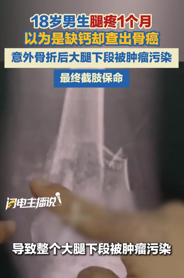 河南郑州,一18岁高三生膝盖特别疼,妈妈却琢磨着“肯定是缺钙”,连着炖了一周排骨,没想到情况越来越差,孩子疼的已经走不了路了,妈妈这才慌张送医,检查发现,孩子膝盖长了一个12厘米的“骨肉瘤”病变范围已经侵蚀大腿,只能截肢!网友:年纪轻轻少一条腿,以后可咋办啊! 闪电新闻10月14号报道,河南郑州18岁的乐乐刚升入高三,正是为高考冲刺的关键时候。 今年7月的一天,他放学回家后揉着膝盖跟妈妈说有点疼,妈妈想着孩子正长个子,大概率是缺钙,没太当回事。 第二天就去菜市场买了排骨,炖了一锅浓浓的排骨汤,还想着多喝点,补补就好了。 可这碗妈妈精心熬煮的排骨汤,没能缓解乐乐的腿疼。 接下来的日子里,乐乐膝盖的疼不仅没消失,反而越来越重。 一开始只是偶尔疼一阵,后来变成了持续性的钝痛,到了晚上躺在床上,疼得翻来覆去睡不着,连走路都得一瘸一拐,腿上稍微用点力就钻心地疼。 妈妈这才慌了神,赶紧带着乐乐去医院检查,拿到诊断书的时候,两个人都傻了眼,乐乐得的是骨肉瘤,也就是常说的骨癌,病变范围已经有12厘米。 确诊后的日子里,妈妈陪着乐乐在医院接受治疗,看着孩子每天被疼痛折磨,心里像被刀割一样。 好在治疗了一段时间后,乐乐的病情有了点好转的迹象,妈妈还偷偷盼着能让孩子保住腿,等病好了接着去学校。 可谁也没料到,一场意外彻底打碎了这个希望。 那天乐乐坐三轮车去做检查,下车时没站稳摔了一跤,左腿当场就不能动了。 医生检查后说,这一摔导致了病理性骨折,肿瘤细胞顺着骨折的创面快速扩散,整个大腿下段都被污染了,已经没有办法保肢,要想控制病情、防止癌细胞转移,只能做截肢手术。 躺在手术台上之前,乐乐还拉着妈妈的手小声问自己以后还能像以前一样走路吗,妈妈强忍着眼泪点头,心里却清楚,孩子的人生要因为这场病彻底改变了。 乐乐的遭遇并不是个例,骨肉瘤大多发生在10到25岁的青少年身上,这个阶段的孩子骨骼长得快,骨细胞分裂活跃,一旦出现异常细胞,很容易扩散开来。 而且这种病的早期症状特别容易和生长痛、运动拉伤弄混,很多家长像乐乐妈妈一样,觉得孩子年轻,腿疼就是缺钙或者累着了,往往会耽误最佳治疗时间。 生长痛和骨癌痛其实有很大区别。生长痛一般是肌肉疼,疼一阵就过去了,多是双侧腿交替着疼,用热毛巾敷一敷或者补点钙就能缓解。 可骨癌痛不一样,它是一点一点加重的,刚开始可能一两周疼一次,过段时间就变成天天疼,疼起来像有东西在骨头里钻,尤其是到了晚上,孩子会疼得睡不着觉。 要是仔细观察,还能发现疼的地方可能会肿起来,摸上去比别的地方热,严重的时候能摸到硬邦邦的肿块,稍微碰一下就疼得厉害。 但其实只要早点发现,骨肉瘤并不是不治之症。 现在常用的治疗方法是先做化疗缩小肿瘤,再做手术,术后接着化疗巩固,不少早期患者都能保住腿。 广州的一所医院最近就给一个16岁的孩子做了膝关节肿瘤假体置换手术,让孩子重新站了起来。 乐乐的手术很成功,虽然失去了一条腿,但至少控制住了病情。 妈妈每次看着孩子空荡荡的裤管掉眼泪,心里满是后悔,要是当初早点带孩子去做检查,要是没把腿疼当成缺钙,是不是孩子就不用遭这么多罪? 对家长来说,孩子的身体信号从来都不能马虎,要是孩子说腿疼,尤其是膝盖疼,千万别想着“忍忍就过去了”,赶紧带孩子去医院做检查,早一点发现,就能让孩子少受点苦,多一分保住健康的希望。
