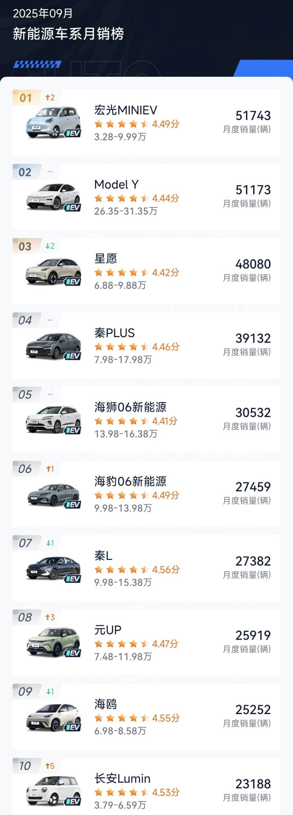 9月份销量明细公布,本以为Model Y依旧会是最大的黑马,没想到宏光MINI增速更惊人,8月份才卖3.78万辆,如今突破5.1万辆,成功逆袭Model Y。当然销量超越特斯拉,不意味着赚钱能力超过特斯拉,因为Model Y的均价是宏光MINI的6倍,也就是说按照宏光MINI均价计算,Model Y实际上卖了51173辆×6=30.7万辆,差距可想而知。